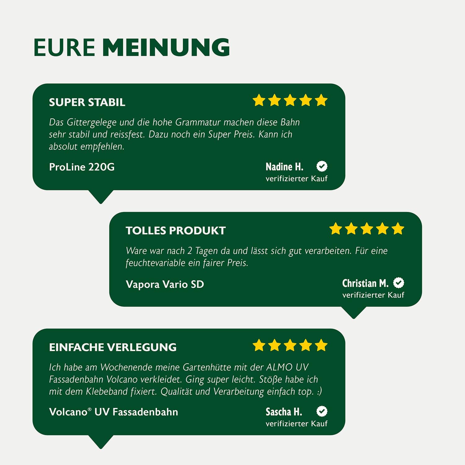 - Hohe Dampfdurchlässigkeit: Mit einem Sd-Wert von nur 0,02 m ist die Bahn hochdiffusionsoffen und fördert ein gesundes Raumklima.