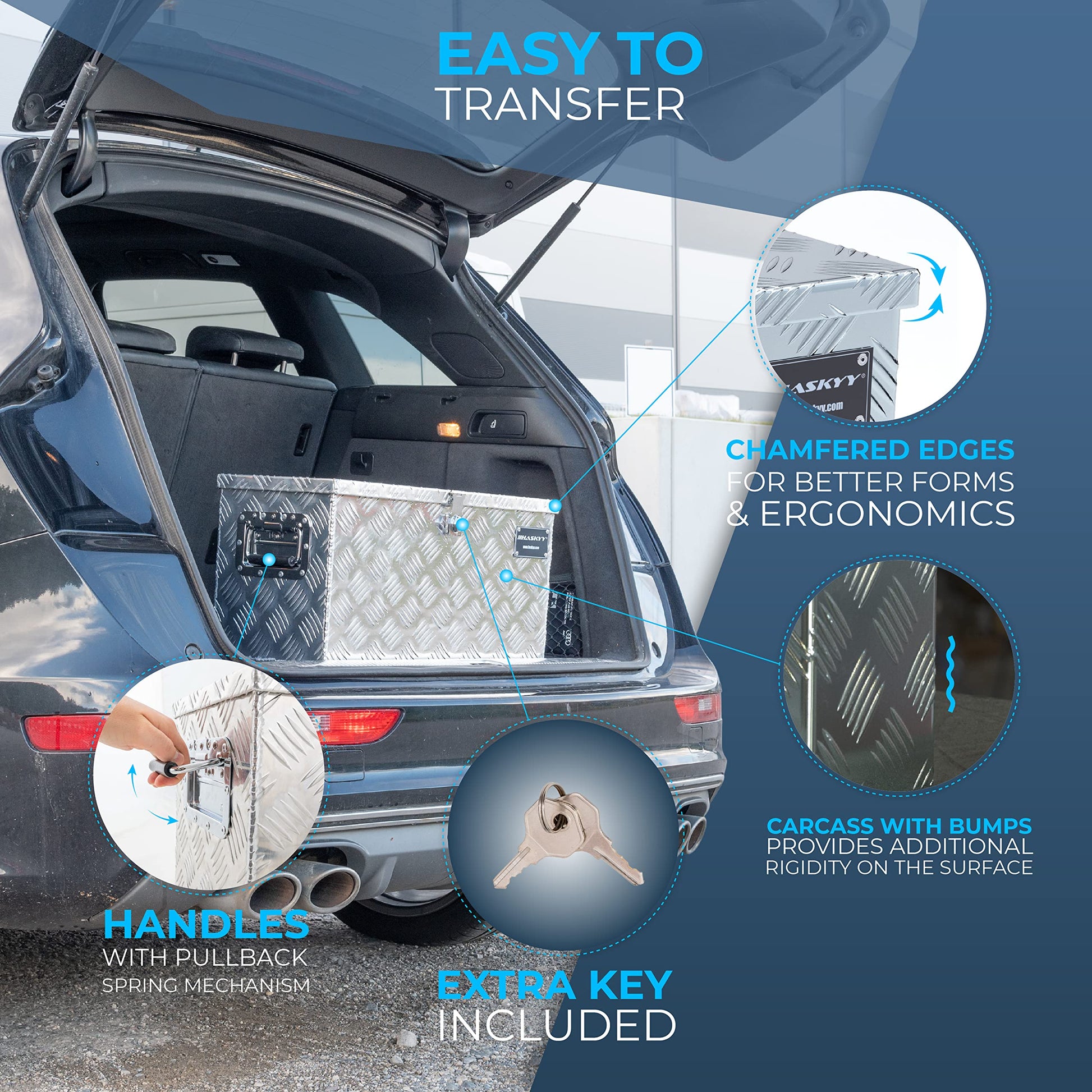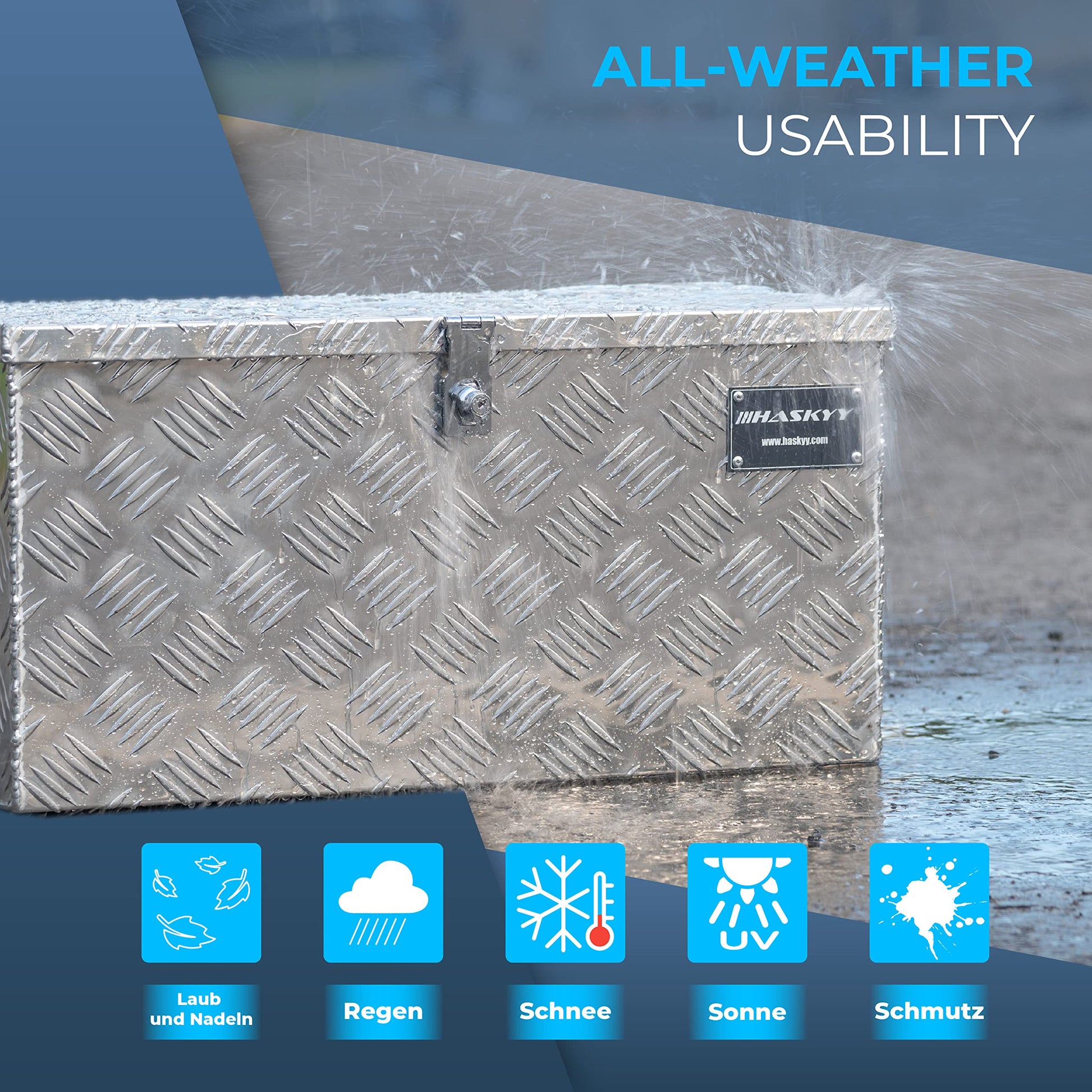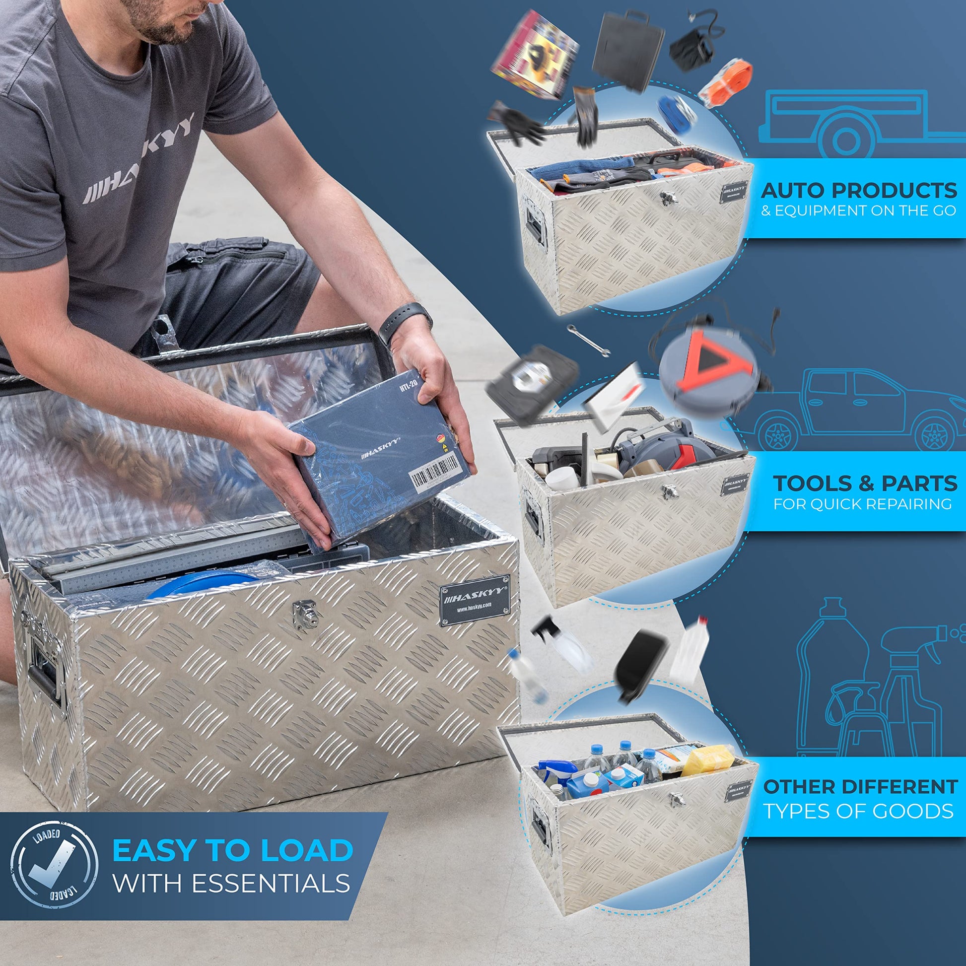 Dank ihres durchdachten Designs kombiniert diese Alubox eine kompakte Form mit einem überraschend grossen Fassungsvermögen. So finden Werkzeuge, Campingzubehör oder Sportausrüstung problemlos Platz, ohne wertvollen Raum zu verschwenden. Die Box ist ein echtes Organisationstalent für jede Fahrt.