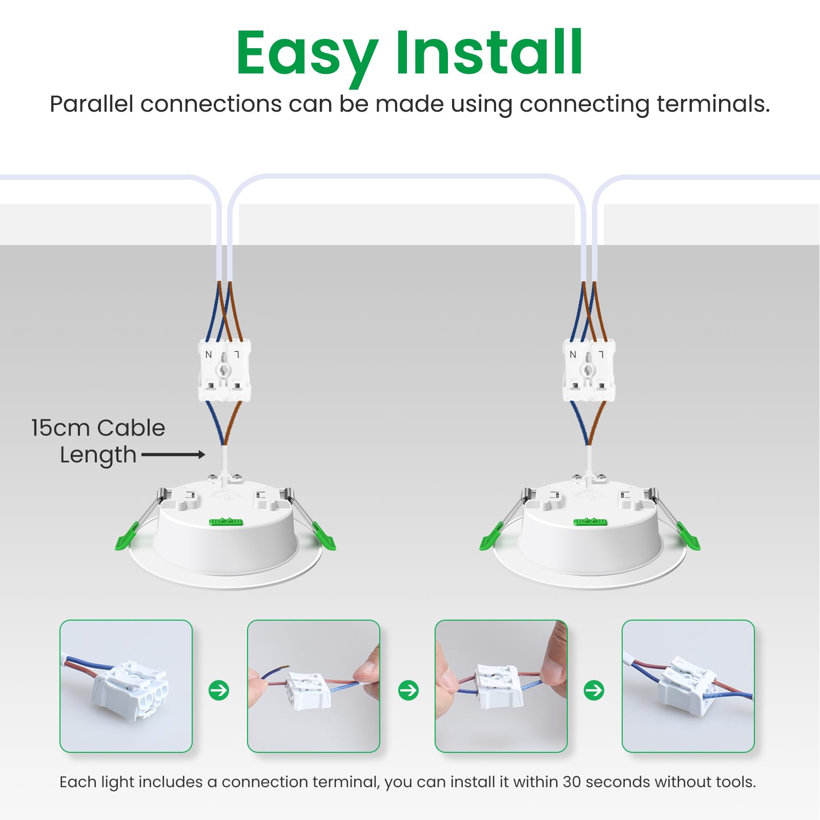 Die Montage ist bemerkenswert unkompliziert. Die Spots werden dank der mitgelieferten Anschlussklemmen direkt an das 230V-Netz angeschlossen, ohne dass ein zusätzlicher Transformator benötigt wird. Das ultraflache Profil ist perfekt für Decken mit begrenztem Platz und sorgt für eine saubere, moderne Optik. Der breite Abstrahlwinkel von 120 Grad leuchtet auch grössere Bereiche gleichmässig aus und lässt keine dunklen Ecken zurück.