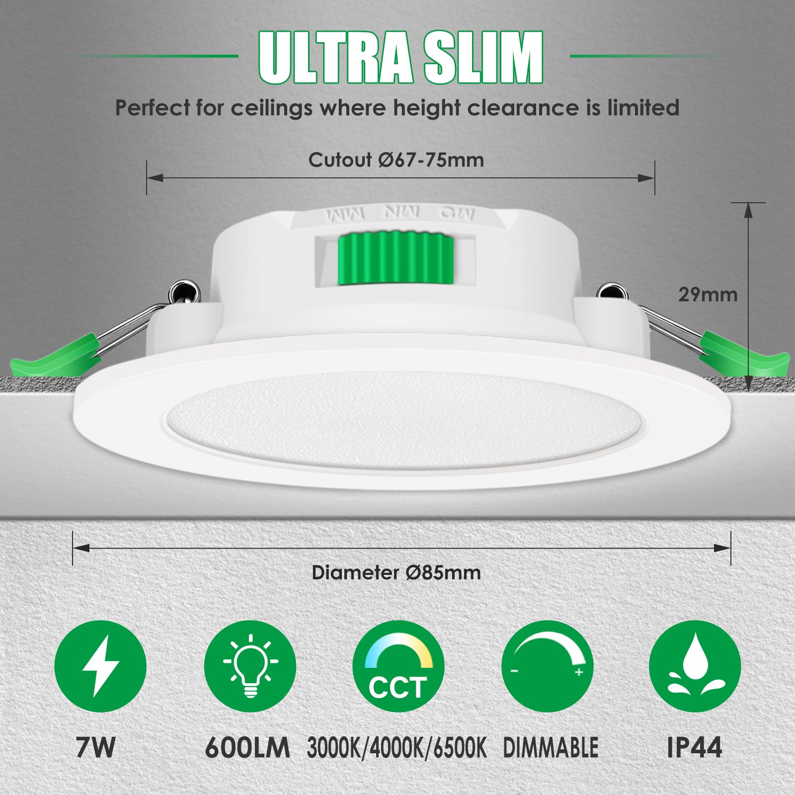 Diese LED-Spots sind mit einer Einbautiefe von nur 29 mm ultraflach und somit ideal für Decken mit wenig Platz. Das erforderliche Lochmass für den Deckenausschnitt sollte zwischen 67 und 75 mm liegen.