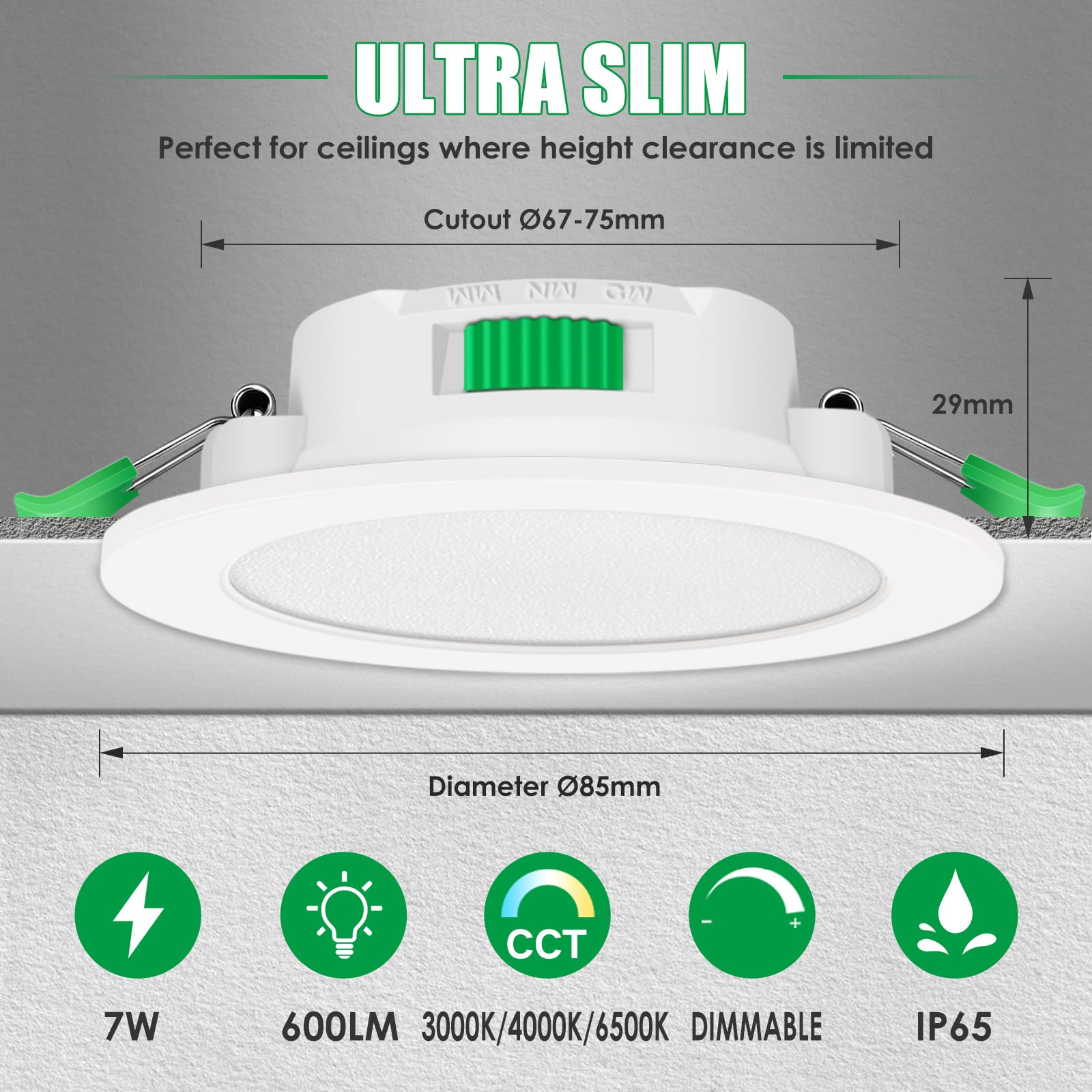 - Ultraflaches Design: Mit einer äusserst geringen Einbautiefe von nur 29 mm eignen sich die Spots auch für Decken mit wenig Platz.