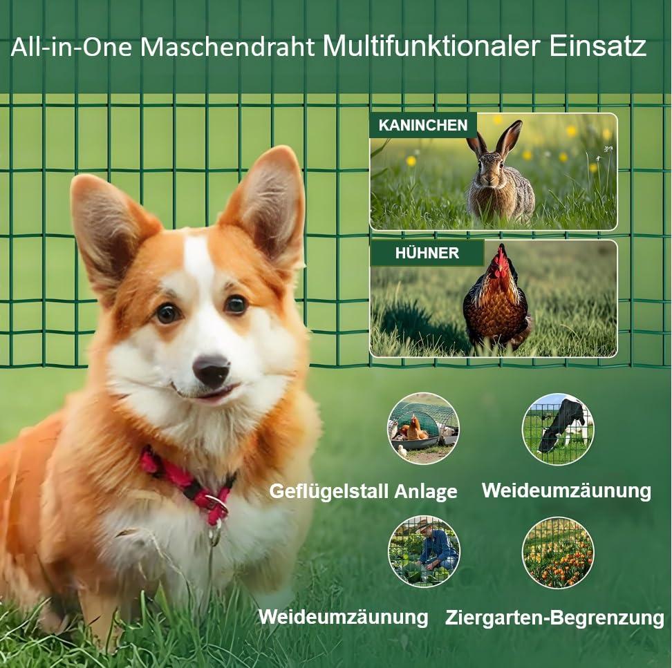 Dieser Zaun ist äusserst vielseitig einsetzbar. Er eignet sich hervorragend als Wildschutzzaun, für den Bau von Tiergehegen für Hunde oder Kaninchen, als Geflügelnetz, zur Sicherung von Hochbeeten oder als dekorative Abgrenzung im Garten.