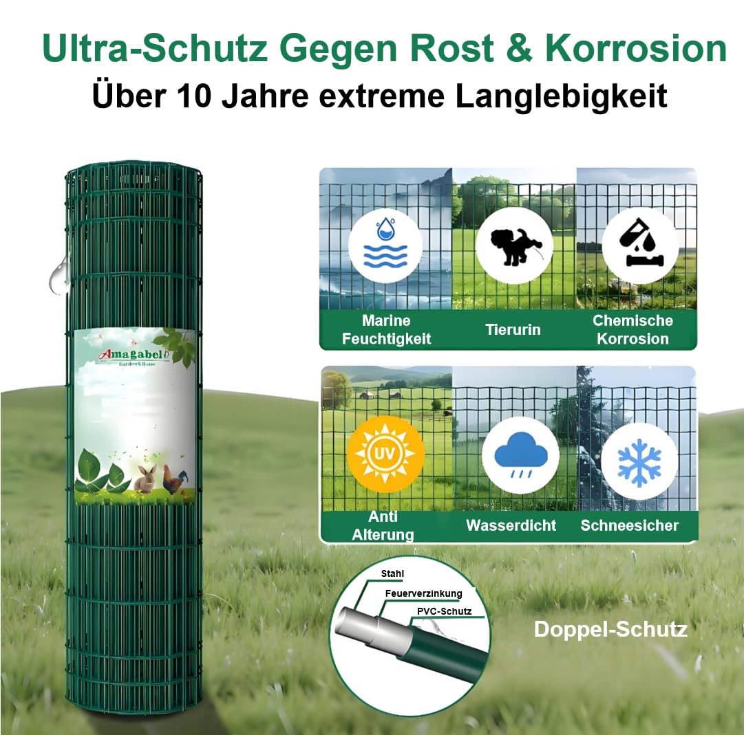Ja, der Zaun ist absolut wetterfest. Er hat einen Kern aus verzinktem Stahl, der mit einer schützenden, grünen PVC-Schicht ummantelt ist. Diese Kombination macht ihn garantiert rostfrei, UV-beständig und widerstandsfähig gegen Regen und Schnee.