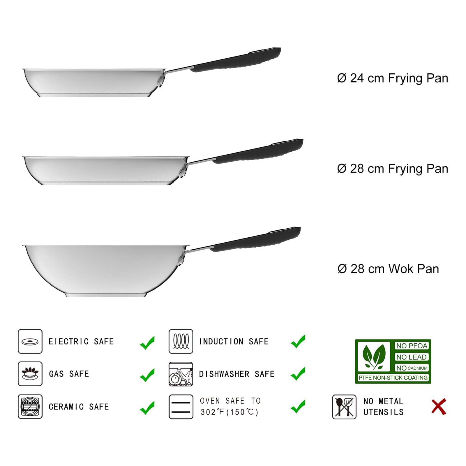 - Umfassendes Set: Beinhaltet eine Bratpfanne (24 cm), eine grosse Bratpfanne (28 cm) und eine Wokpfanne (28 cm) für maximale Vielseitigkeit.