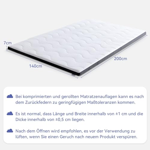 Verwandeln Sie Ihre Matratze in eine Wohlfühloase mit diesem 7 cm hohen Matratzen-Topper. Die Auflage aus Gelschaum ist speziell dafür konzipiert, Ihren Schlafkomfort zu steigern und für eine angenehme Temperatur zu sorgen.