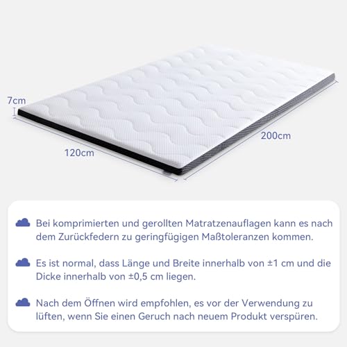 - Masse der Matratzenauflage: 120 x 200 x 7 cm