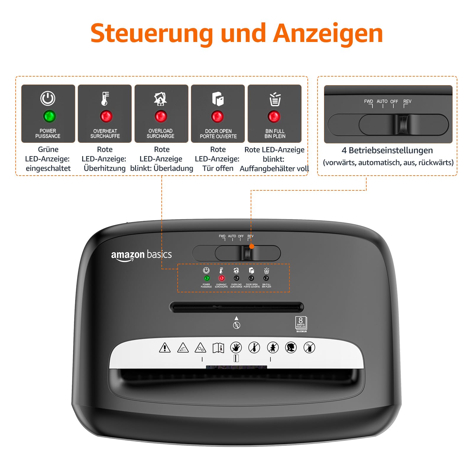 - Einfache Bedienung: Ein klarer Schalter mit vier Modi (Auto, Aus, Rückwärts, Vorwärts) und übersichtliche LED-Anzeigen informieren jederzeit über den Betriebsstatus (Ein, Überhitzung, Überlastung, Tür offen, Behälter voll).