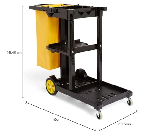 Er bietet zwei grosse Ablageflächen sowie integrierte Halterungen und Clips für Besen oder Mopps. Dadurch sind alle Reinigungsmittel und -geräte übersichtlich geordnet und stets griffbereit, was die Arbeitsabläufe optimiert und wertvolle Zeit spart.