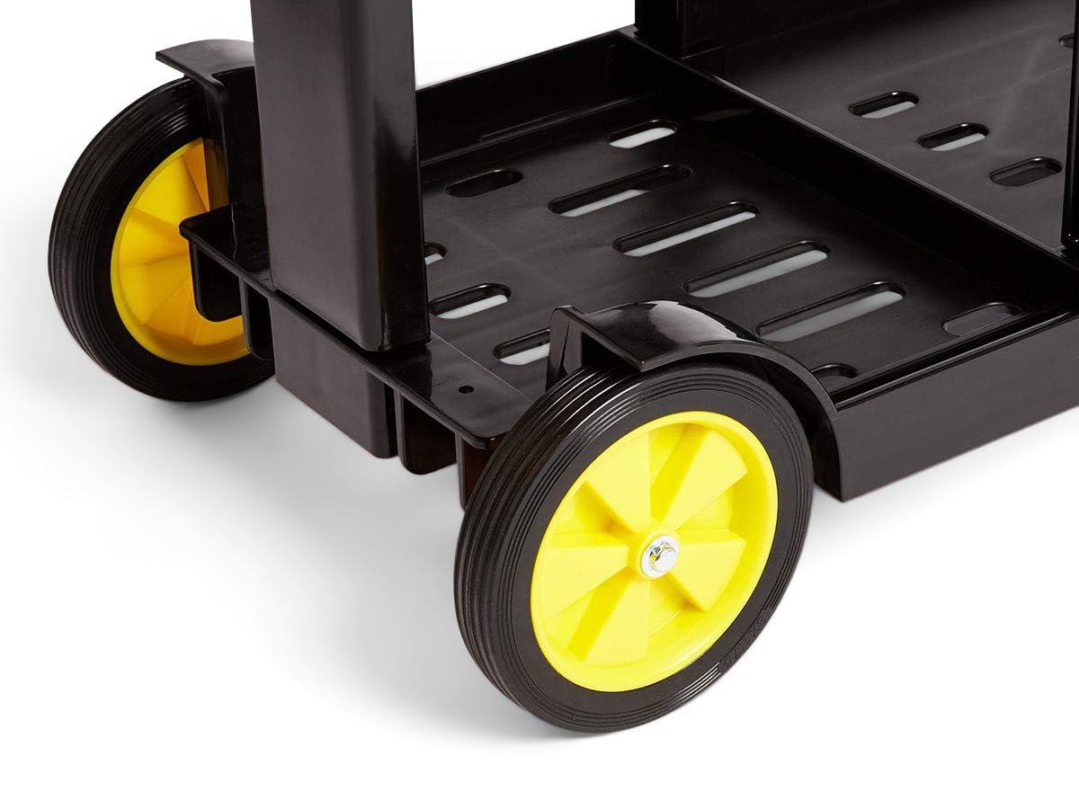 - Robuste Kunststoffkonstruktion und abriebfeste Lenkrollen für hohe Langlebigkeit und Wendigkeit.