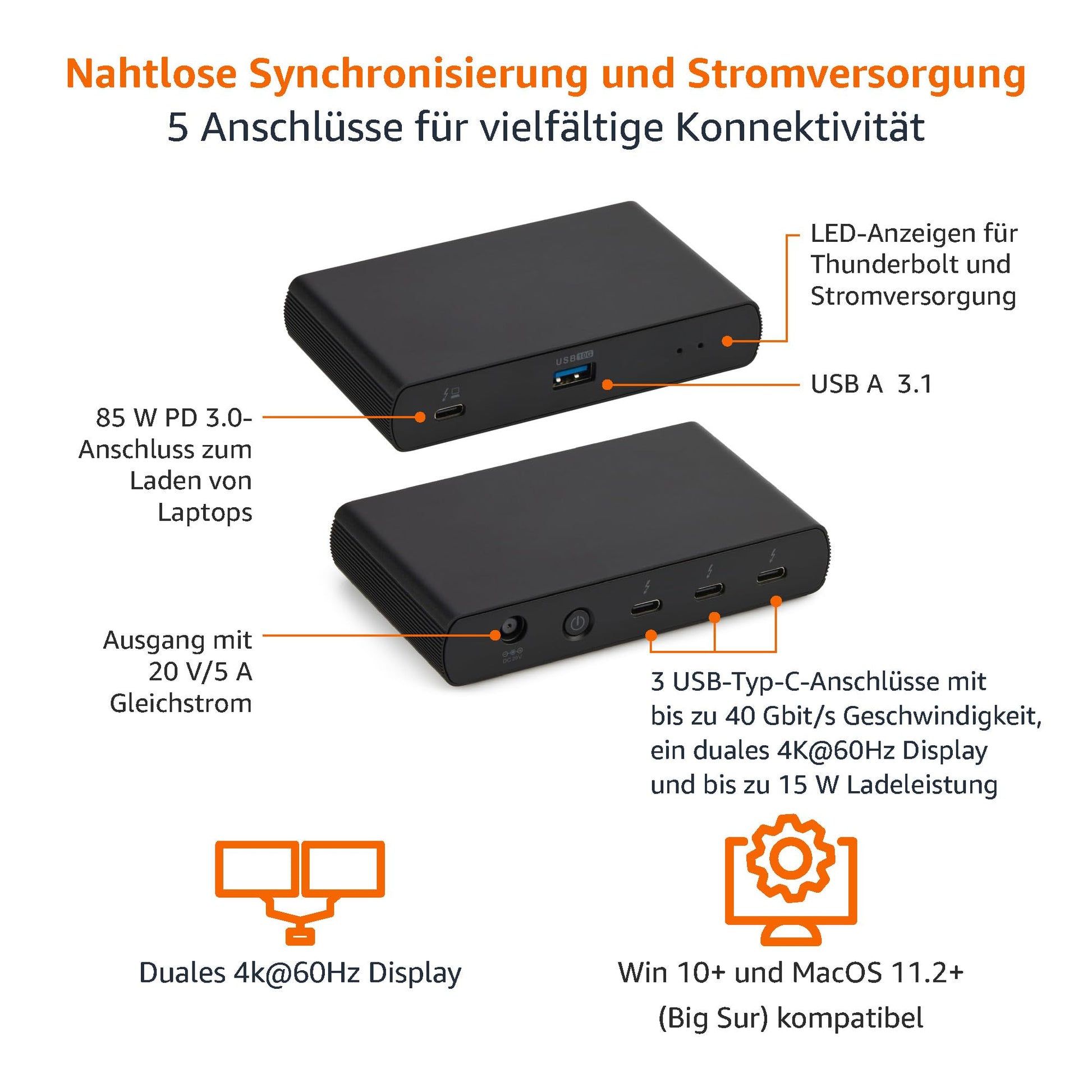 - Anschlüsse: 3x Downstream Thunderbolt 4 (unterstützt Dual-Display), 1x USB-A 3.1