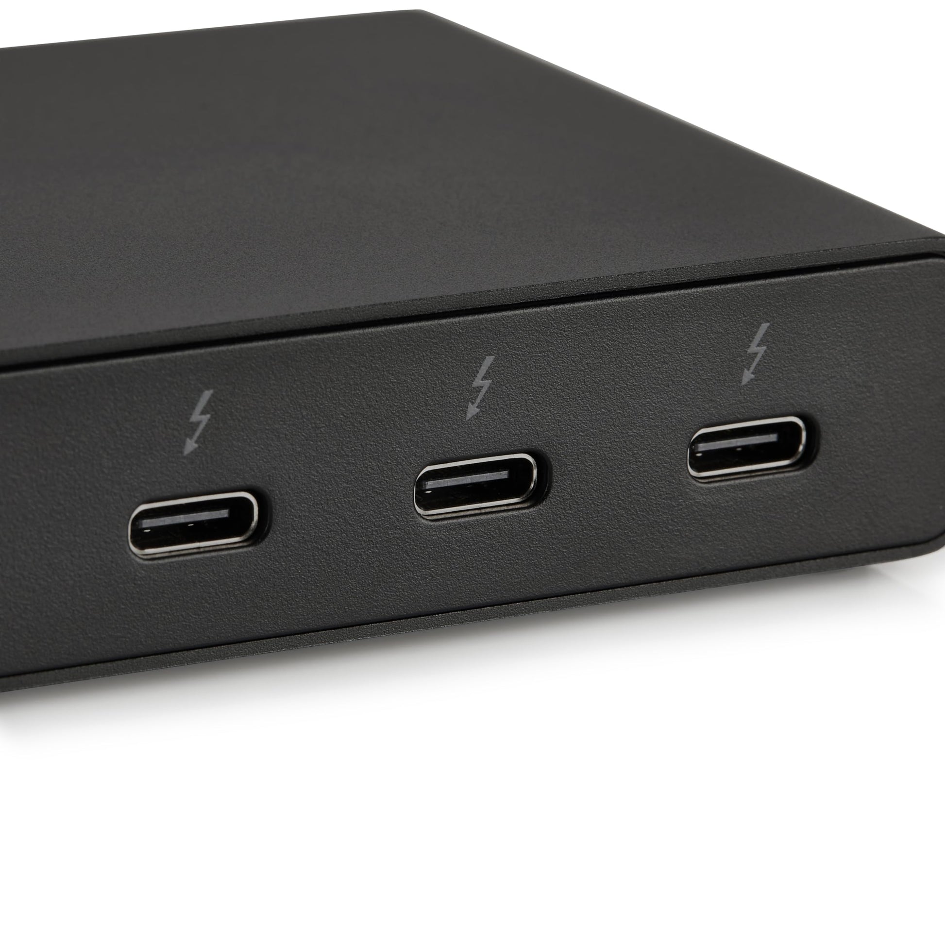 Die Dockingstation verfügt über drei Downstream Thunderbolt 4-Anschlüsse und einen USB-A 3.1-Anschluss. An die Thunderbolt-Ports können Sie Monitore, externe SSDs und andere Hochleistungs-Peripheriegeräte anschliessen. Der USB-A-Anschluss eignet sich für Geräte wie Tastaturen, Mäuse oder USB-Sticks.