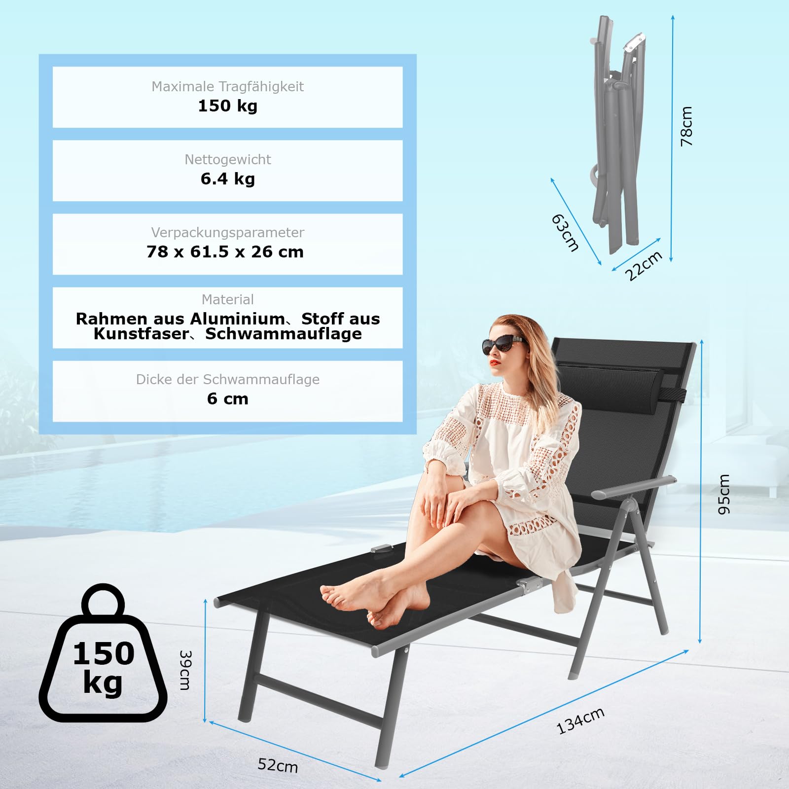 Die Sonnenliege ist sehr robust. Sie verfügt über einen stabilen Rahmen aus hochwertigem, rostfreiem Aluminium und ist für eine maximale Belastbarkeit von bis zu 150 kg ausgelegt.