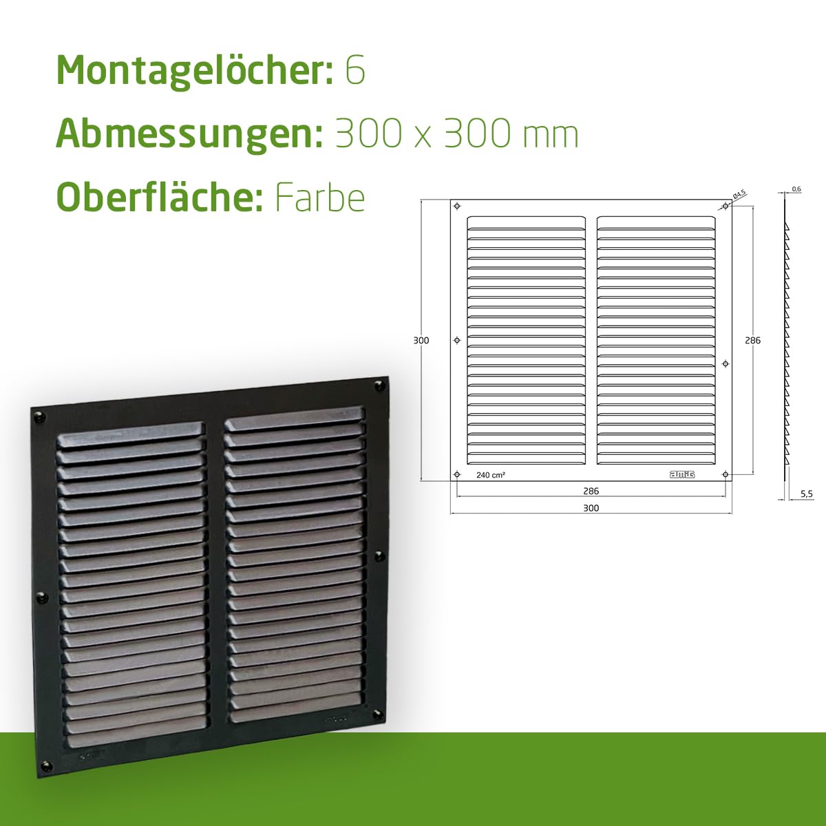 Dieses Produkt wird als praktisches 5er-Set geliefert. Sie erhalten also fünf identische, quadratische Lüftungsgitter in Schwarz (300 x 300 mm), ideal um mehrere Räume einheitlich auszustatten oder eine grosse Fläche abzudecken.