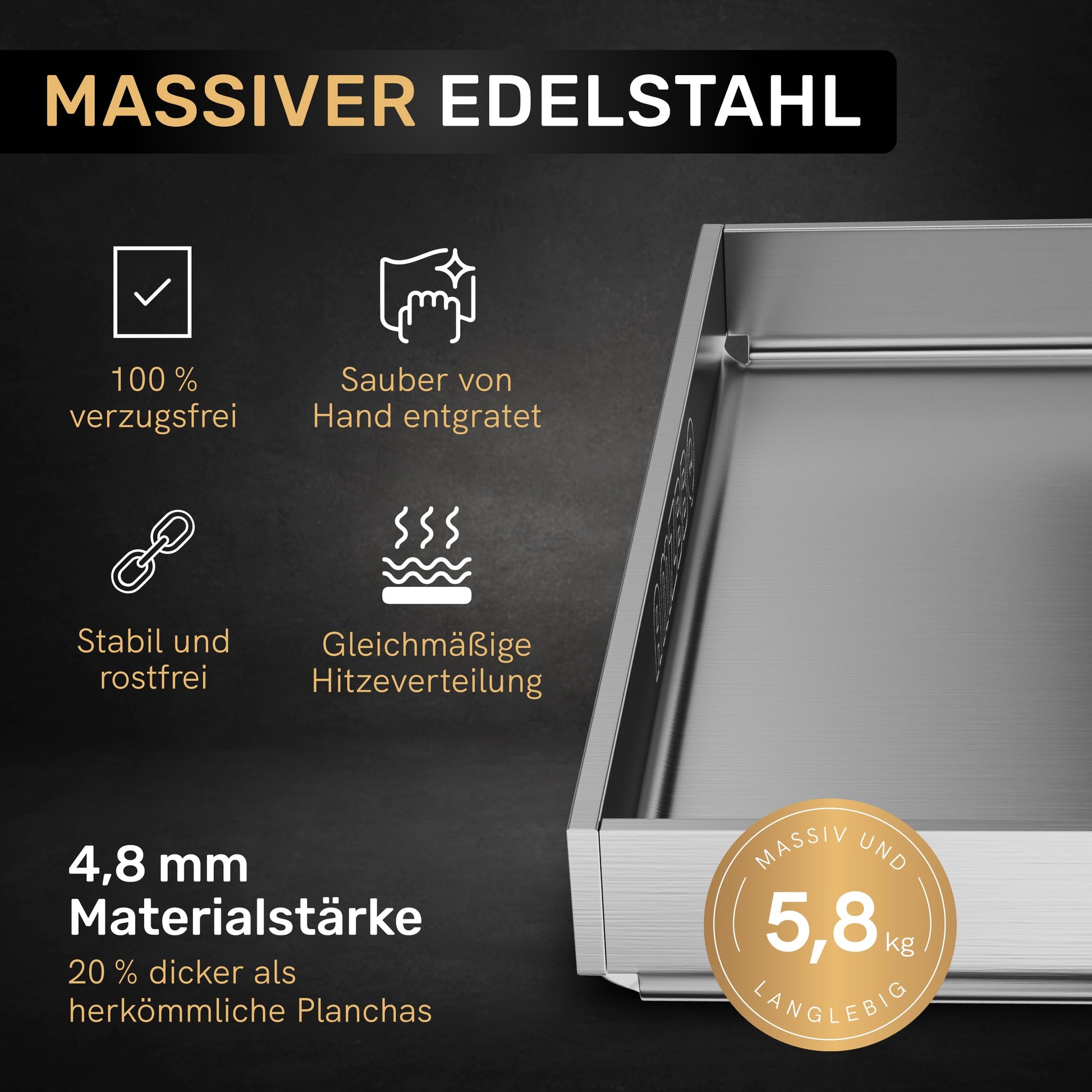 Die massive Edelstahlkonstruktion garantiert eine exzellente Wärmespeicherung und eine absolut gleichmässige Hitzeverteilung über die gesamte Fläche. Dies führt zu perfekten Garergebnissen, egal ob Sie Fleisch scharf anbraten, Gemüse schonend garen oder sogar Pancakes zubereiten. Die robuste Bauweise sorgt nicht nur für eine beeindruckende Langlebigkeit, sondern verhindert auch ein Verziehen der Platte bei hohen Temperaturen.