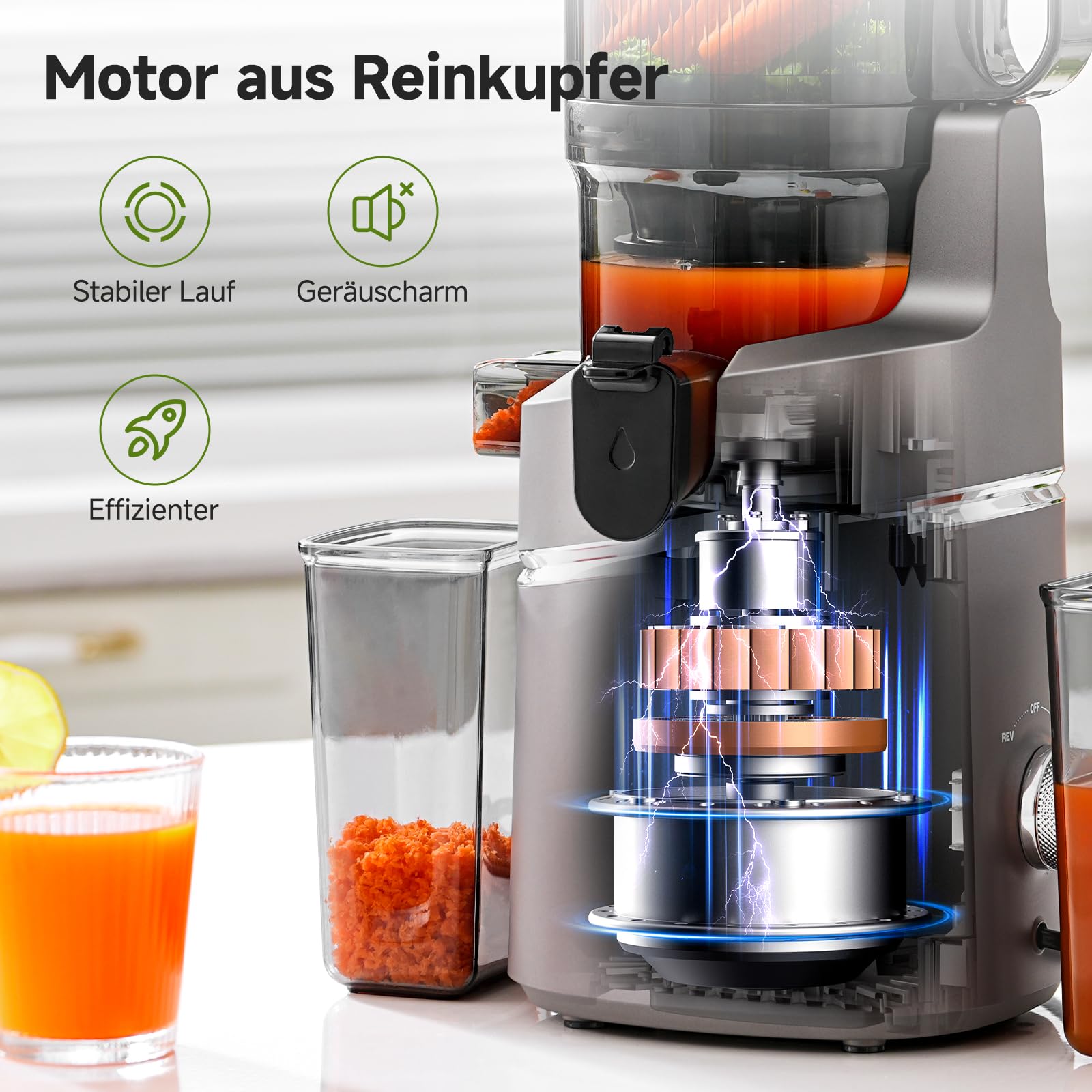 Der AMZCHEF Juicer nutzt die schonende Kaltpresstechnologie. Ein kraftvoller 250-Watt-Motor treibt eine Schnecke langsam an, wodurch keine Hitze entsteht und die Oxidation minimiert wird. So bleiben wertvolle Vitamine, Enzyme und Mineralstoffe optimal geschützt.