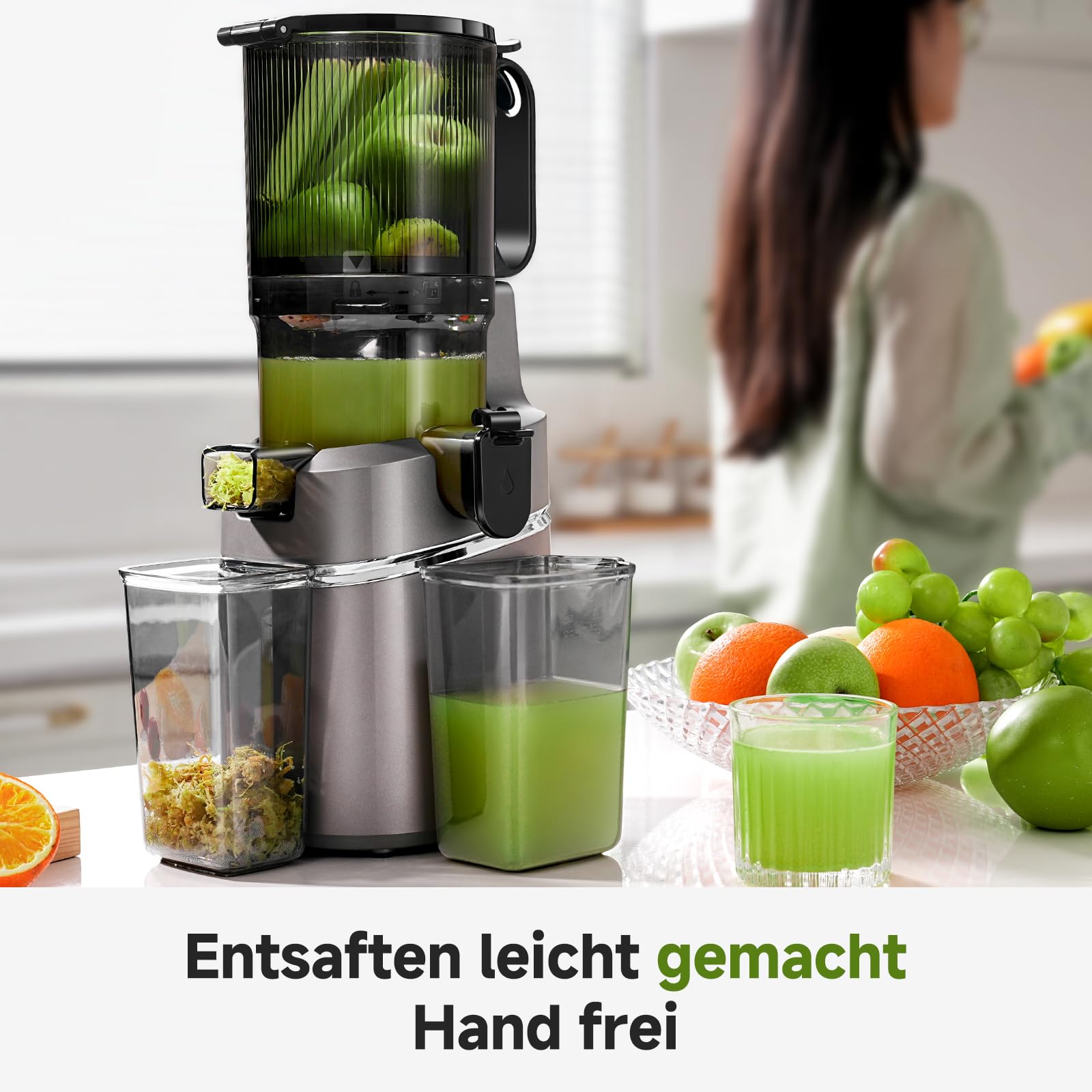 - Automatisches Entsaften ohne Unterbruch: Dank der extragrossen 135-mm-Öffnung und einem Behältervolumen von 1.8 Litern entfällt das ständige Nachfüllen von Zutaten.