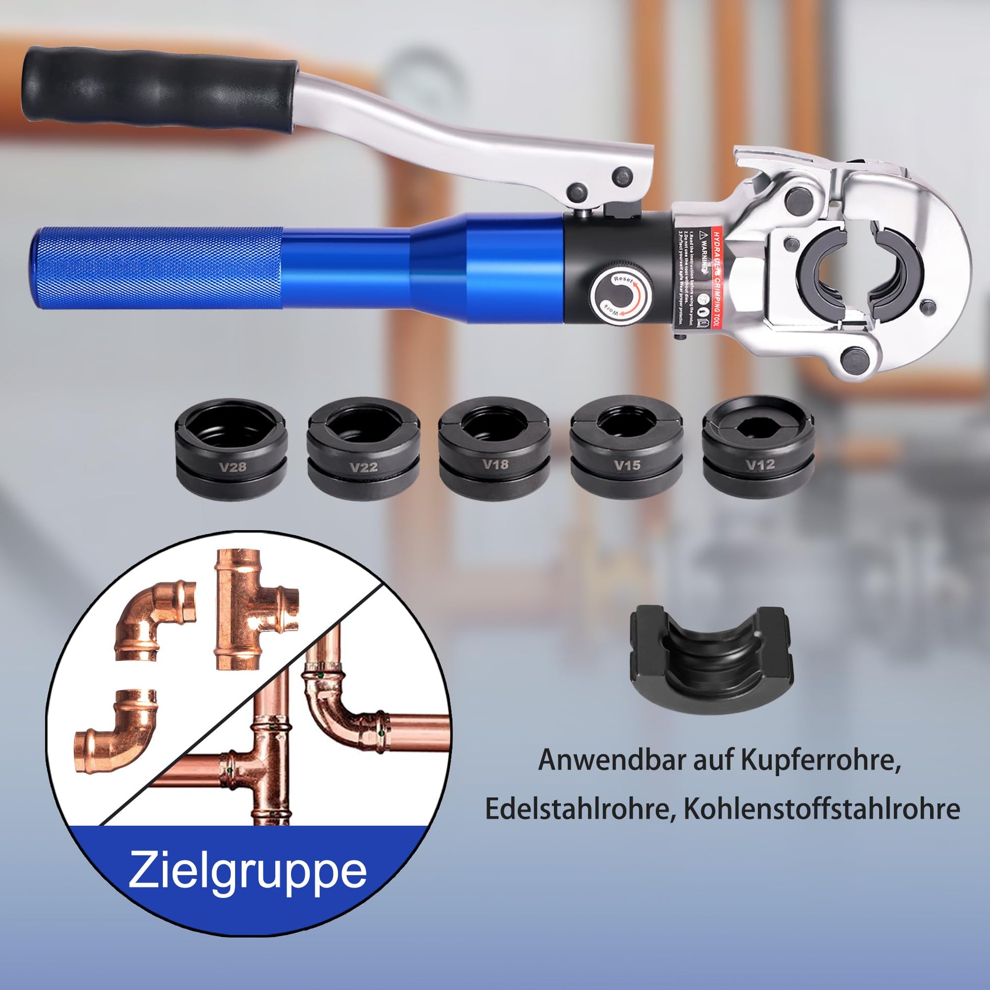 Dieses Set ist für die professionelle Verpressung von Kupfer-, C-Stahl- und Edelstahlrohren konzipiert. Es enthält V-Kontur Pressbacken für die fünf gängigsten Grössen: 12, 15, 18, 22 und 28 mm, was es zu einem vielseitigen Werkzeug für Sanitär- und Heizungsinstallationen macht.