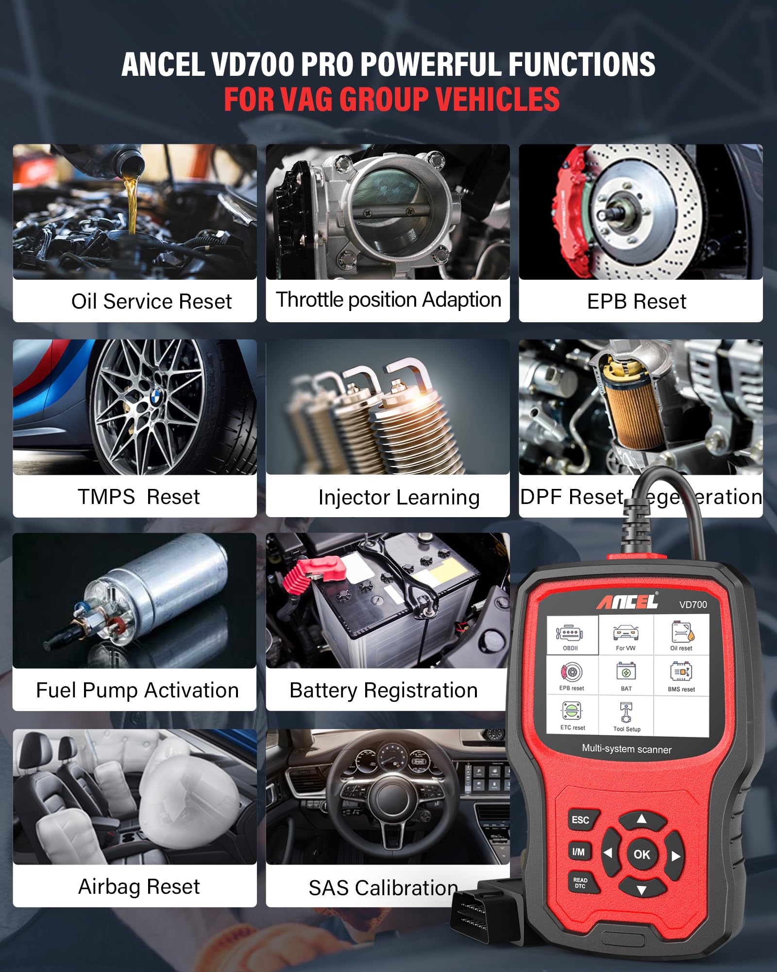Das ANCEL VD700Pro ist Ihr spezialisierter Partner für eine umfassende und tiefgreifende Fahrzeugdiagnose bei den meisten Modellen des Volkswagen Konzerns (VAG). Es ermöglicht Ihnen, Fehler schnell zu identifizieren und wichtige Servicearbeiten selbst durchzuführen.