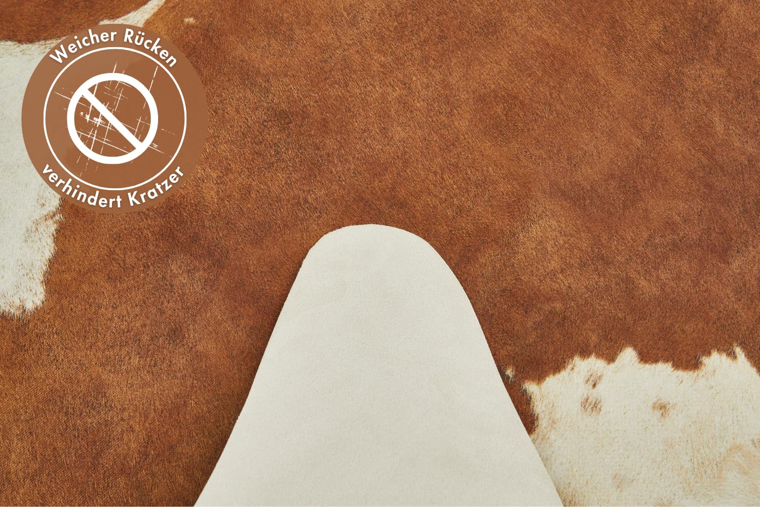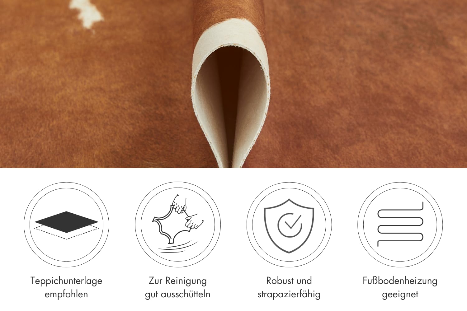 Verleihen Sie Ihrem Zuhause einen Hauch von rustikalem Charme mit diesem exquisiten Kuhfell-Imitat. Der Teppich kombiniert stilvolles Design mit einer ethischen und pflegeleichten Alternative zu echtem Fell.