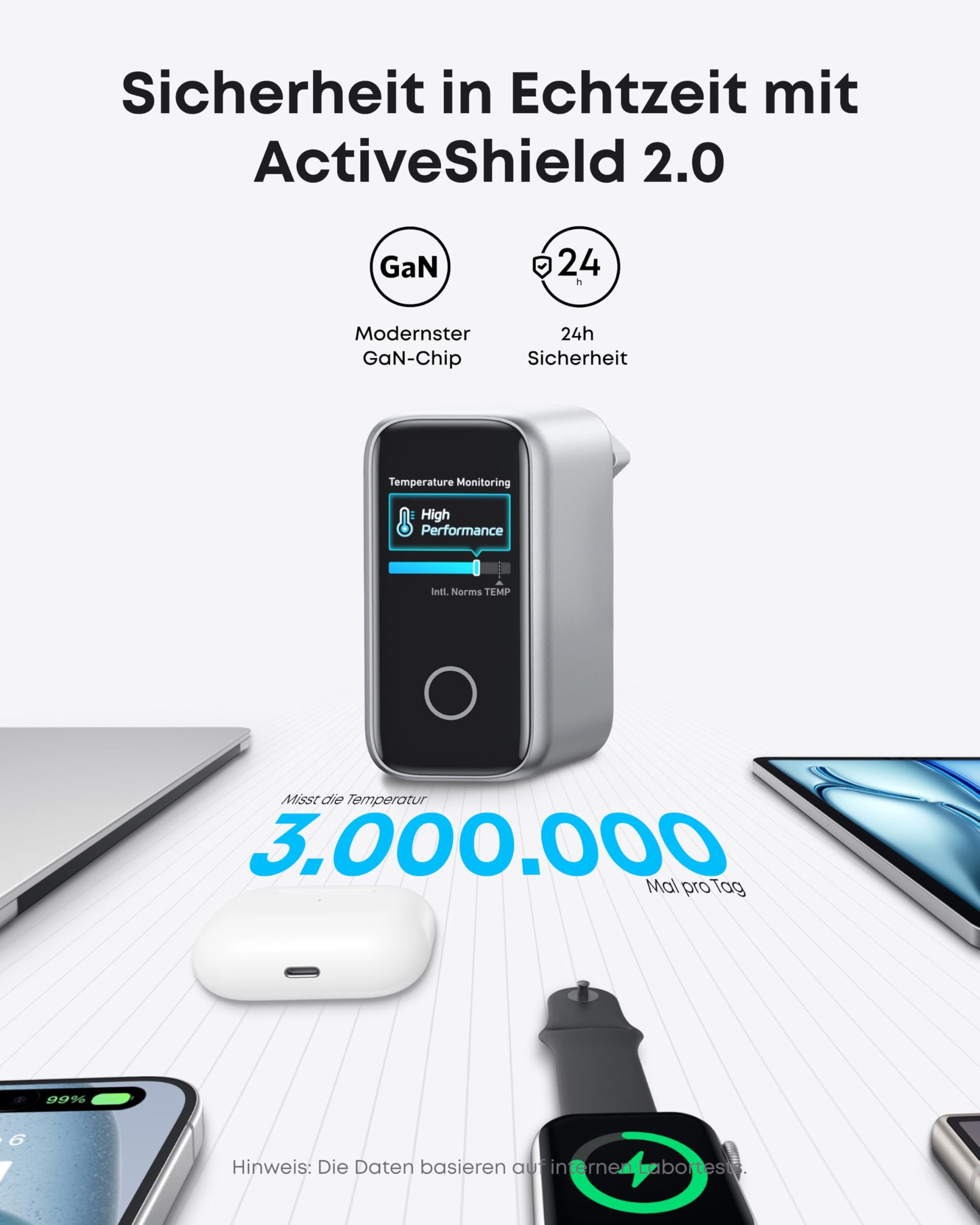 - ActiveShield 3.0 Sicherheitssystem: Das innovative System überwacht die Temperatur mehr als 6 Millionen Mal pro Tag, um einen maximal sicheren Ladevorgang für alle angeschlossenen Geräte zu gewährleisten.