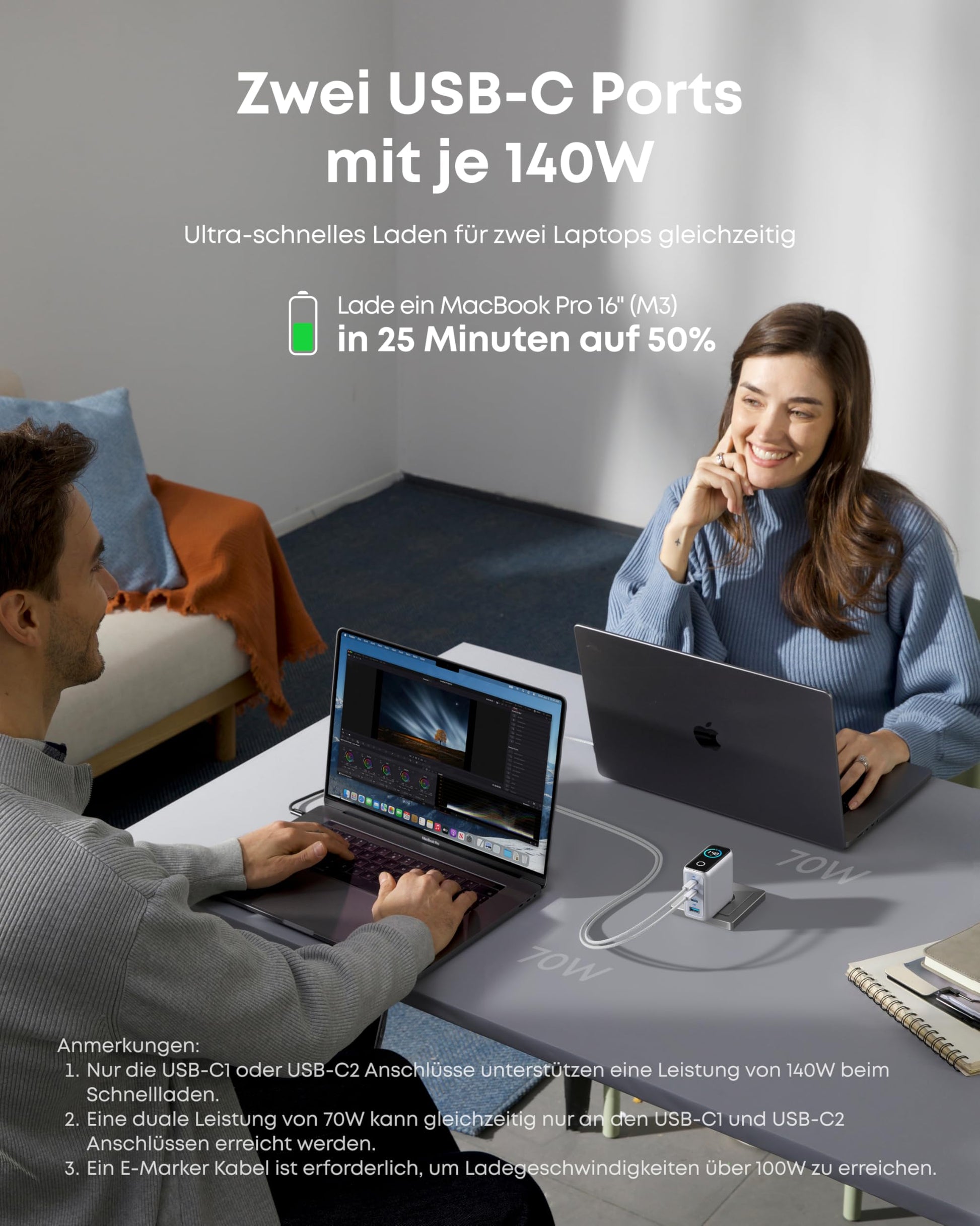 - Zwei Hochgeschwindigkeits-Anschlüsse: Mit den beiden leistungsstarken 140W USB-C-Ports ist beispielsweise ein MacBook Air 15" in nur 30 Minuten zu 50% geladen.