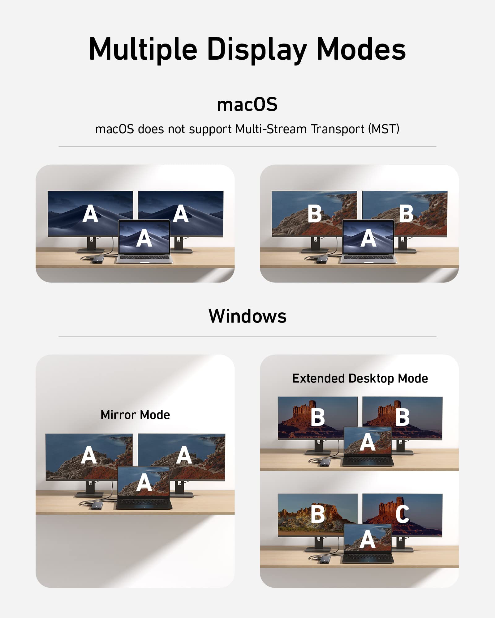 Erweitern Sie Ihren digitalen Arbeitsbereich auf zwei zusätzliche Monitore. Schliessen Sie diese einfach via HDMI und DisplayPort an und geniessen Sie gestochen scharfe Auflösungen von bis zu 2K bei 60 Hz (mit DP 1.4 Laptops) oder 1080p bei 60 Hz (mit DP 1.2 Laptops). Perfekt für produktives Multitasking und beeindruckende Präsentationen.