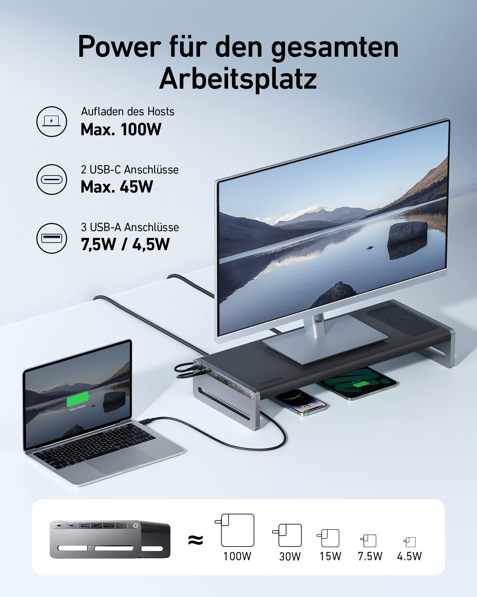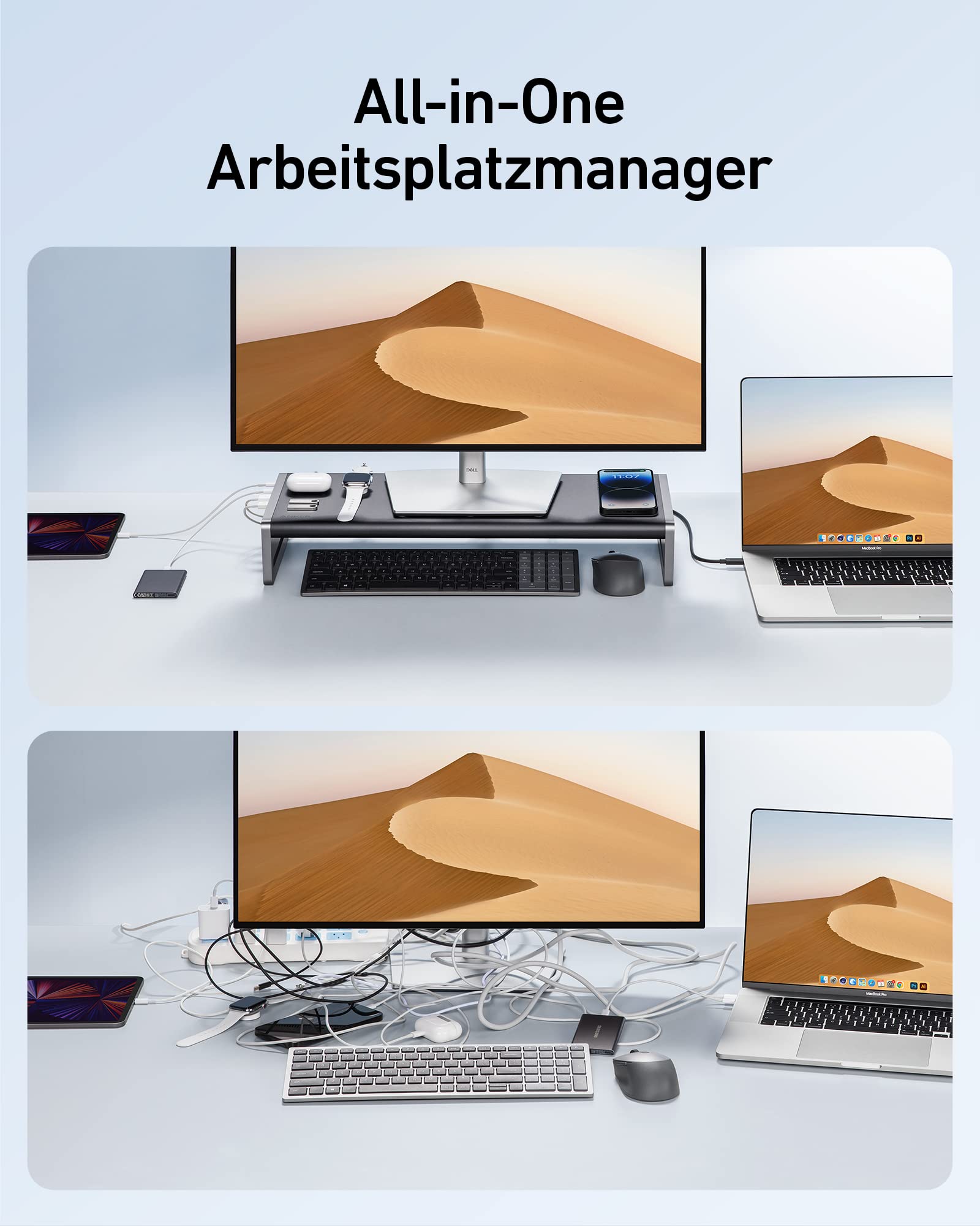 Verwandeln Sie Ihren Arbeitsplatz in eine Oase der Effizienz und Ordnung. Diese multifunktionale Docking Station von Anker ist gleichzeitig ein ergonomischer Monitorständer und die zentrale Schnittstelle für all Ihre Geräte.