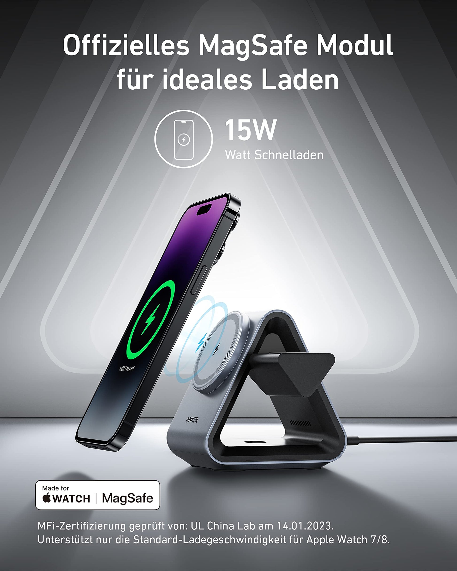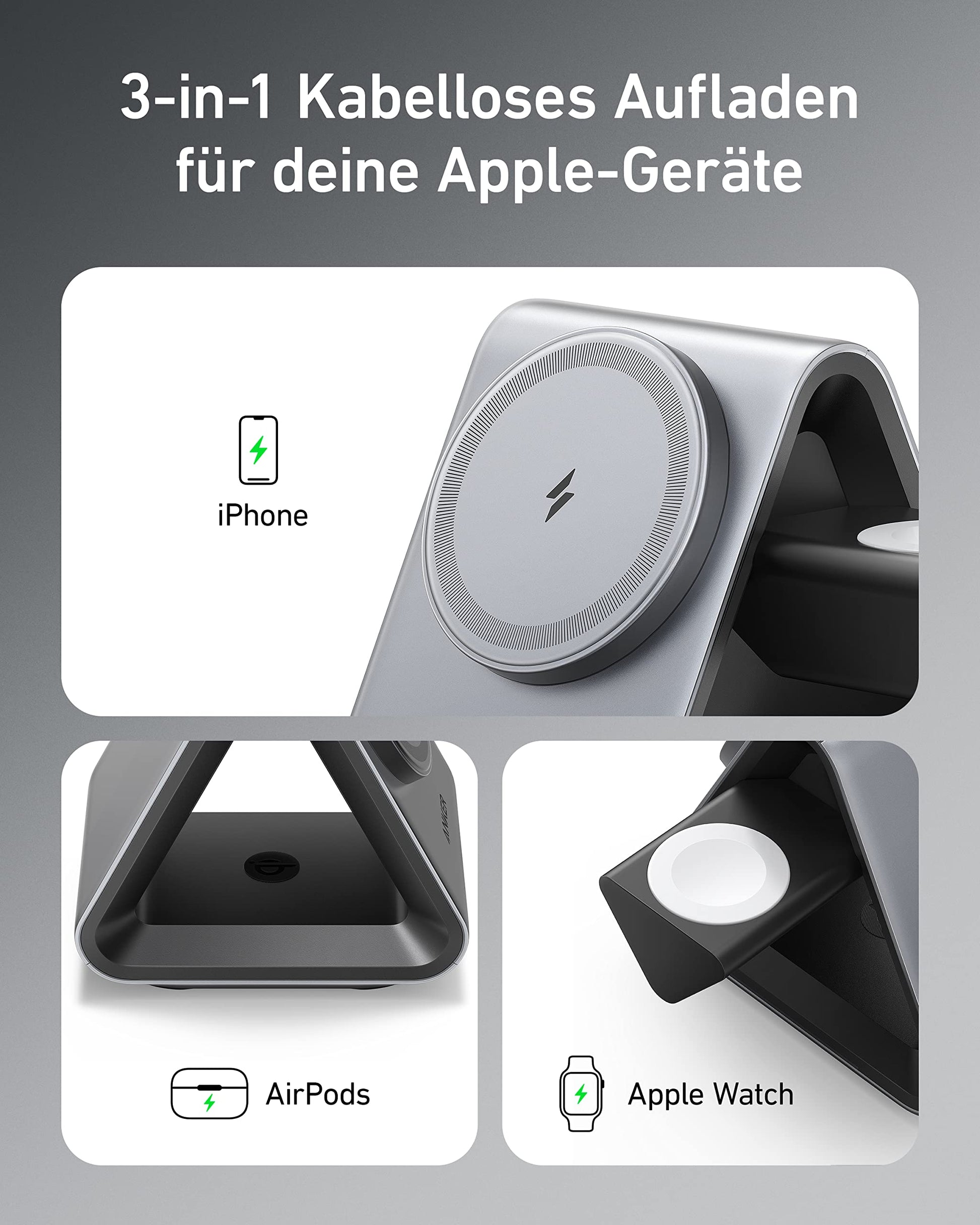 Verabschieden Sie sich vom Kabelchaos auf Ihrem Pult. Diese elegante 3-in-1 Ladestation von Anker versorgt Ihr iPhone, Ihre Apple Watch und Ihre AirPods gleichzeitig mit Energie – und das komplett kabellos und mit beeindruckender Geschwindigkeit.
