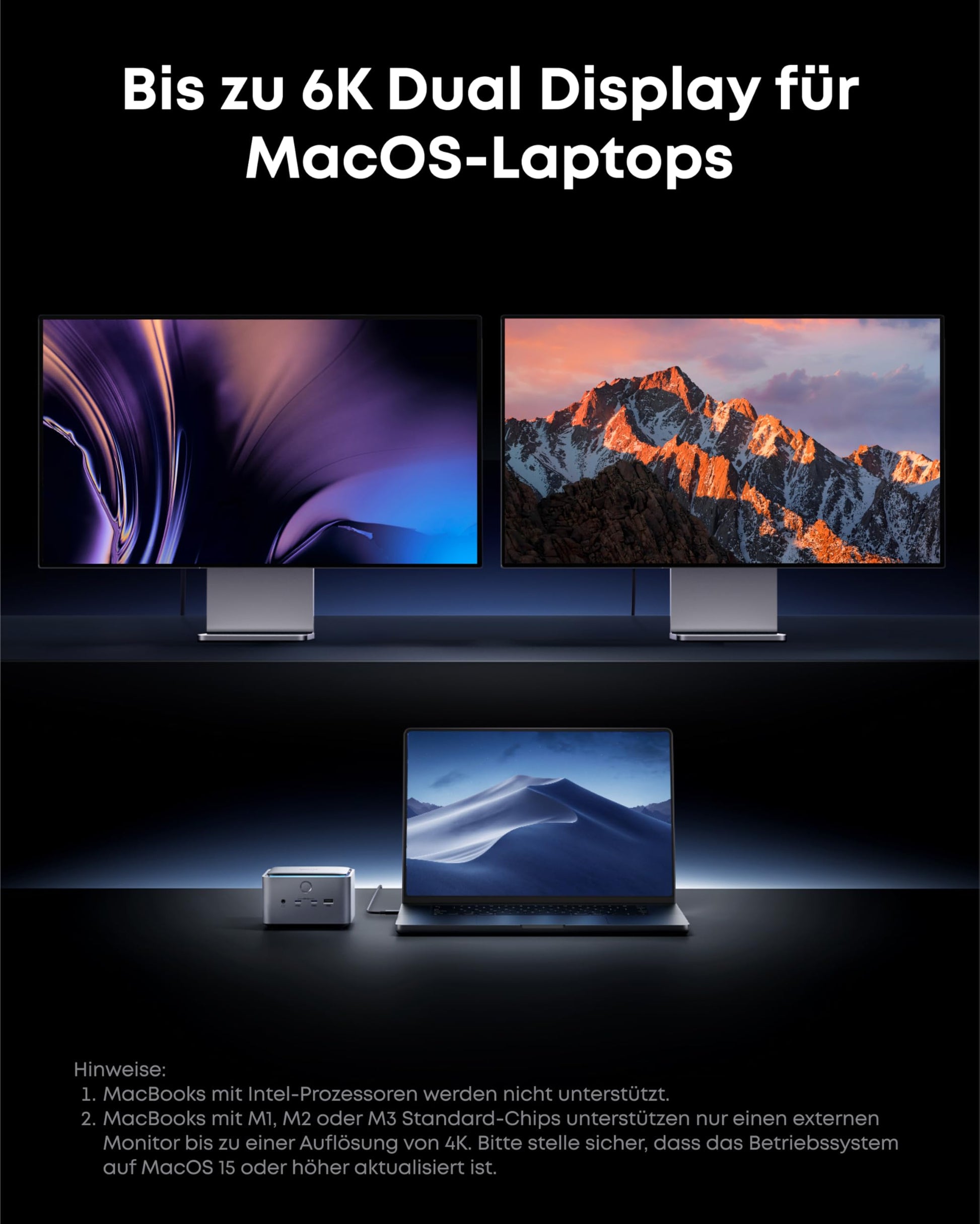 - Brillante Bildqualität: Unterstützt einen einzelnen Bildschirm mit einer Auflösung von bis zu 8K bei 60Hz oder eine Konfiguration mit zwei Bildschirmen mit bis zu 6K und 4K bei 60Hz, abhängig von den Spezifikationen Ihres Laptops.
