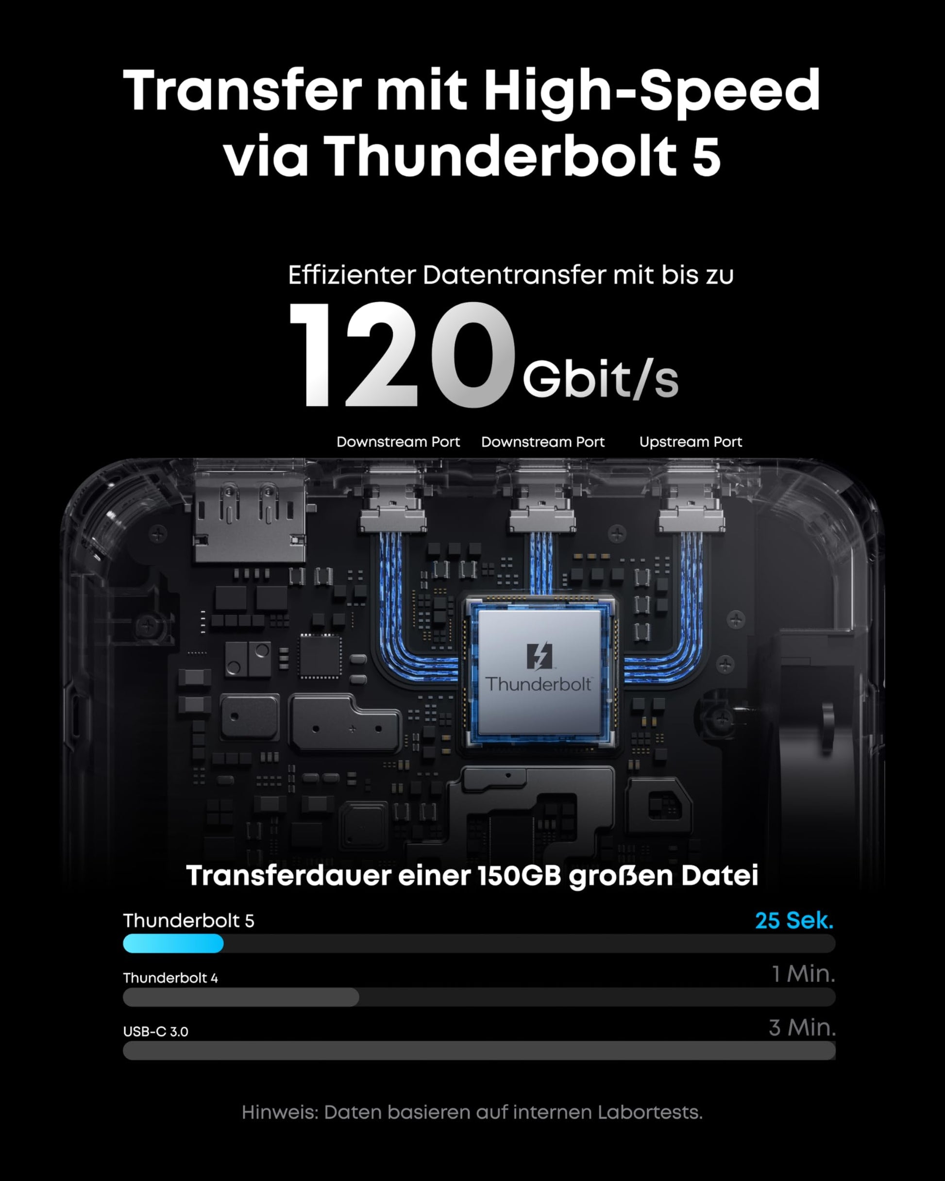 Beschleunigen Sie Ihren Workflow: Übertragen Sie riesige Datenmengen in Rekordzeit. Dank der Thunderbolt 5 Technologie mit bis zu 120 Gbit/s wird beispielsweise eine 150 GB grosse Datei in nur 10 Sekunden verschoben, was Ihre Produktivität massiv steigert.