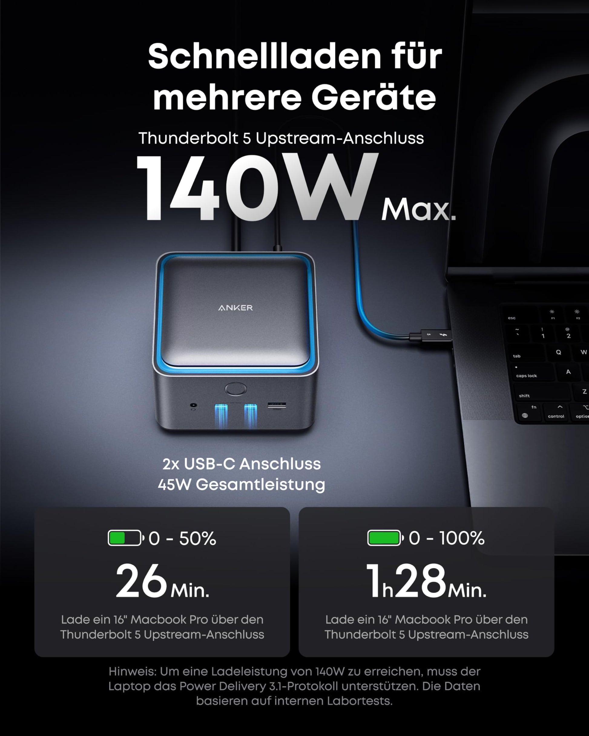 Ja, absolut. Mit bis zu 140W Ladeleistung über das Power Delivery 3.1 Protokoll versorgt die Docking Station selbst anspruchsvollste Laptops zuverlässig mit Strom. Zusätzlich stehen an der Vorderseite zwei USB-C-Anschlüsse zur Verfügung, die sich 45W teilen, um Ihr Smartphone oder andere Geräte schnell aufzuladen.