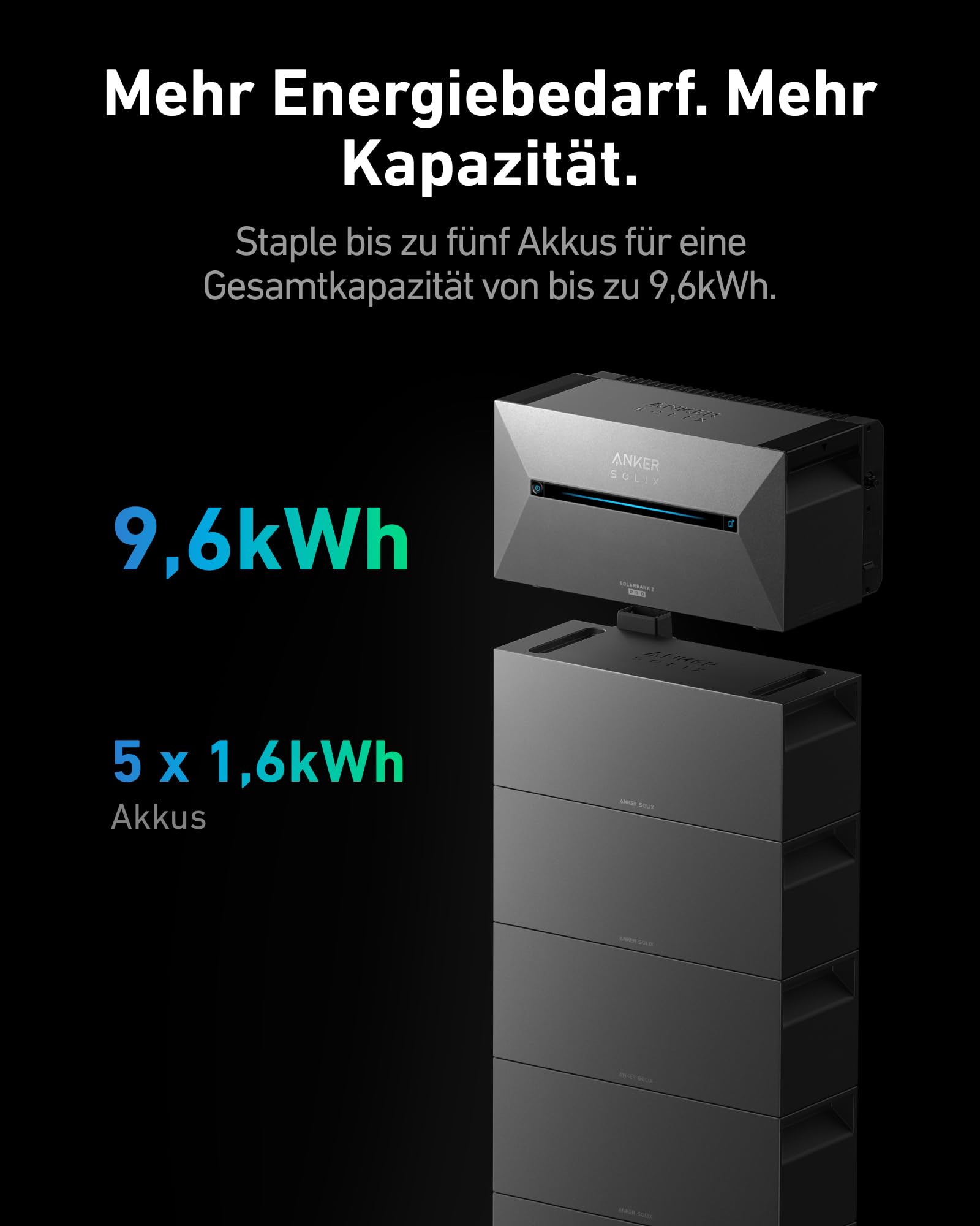 Sie können Ihre Anker SOLIX Solarbank 2 mit bis zu fünf BP1600 Erweiterungsakkus ausstatten. Dadurch lässt sich die Gesamtkapazität von den anfänglichen 1600Wh auf beeindruckende 9600Wh steigern, um Ihren Energiebedarf flexibel zu decken.
