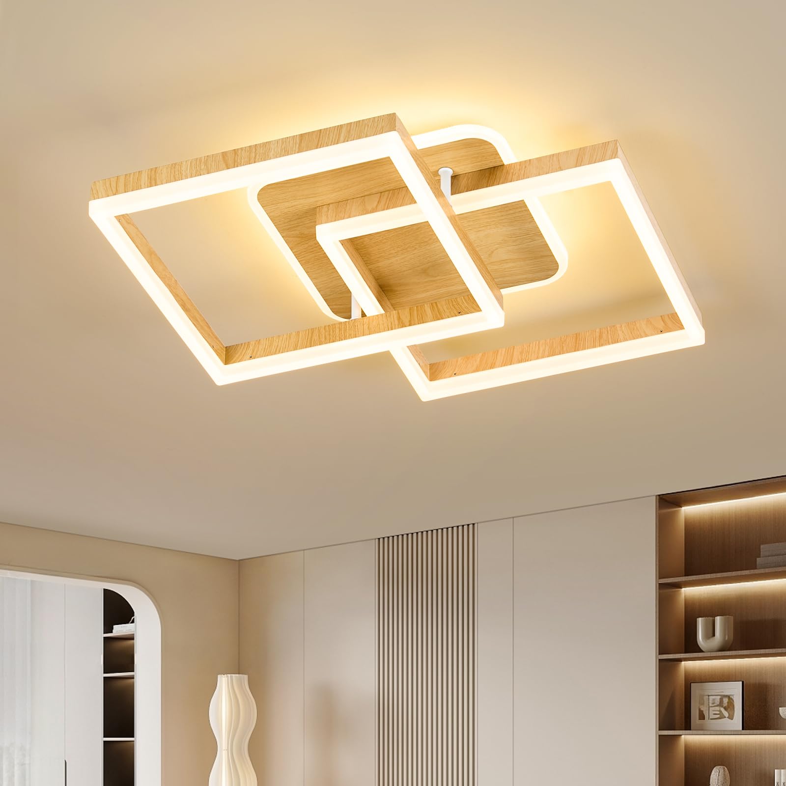 - Modernes Design: Die Leuchte besticht durch ihre geometrische Form, die aus zwei grossen, überlappenden Quadratrahmen und einem kleineren Rahmen in Holzoptik besteht. Diese geradlinige Gestaltung verleiht jedem Raum eine dynamische Note.