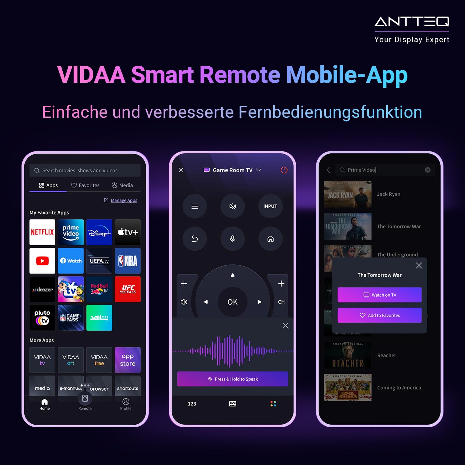 - Sprachfernbedienung: Steuern Sie Ihren Fernseher und finden Sie Inhalte bequem per Sprachbefehl.