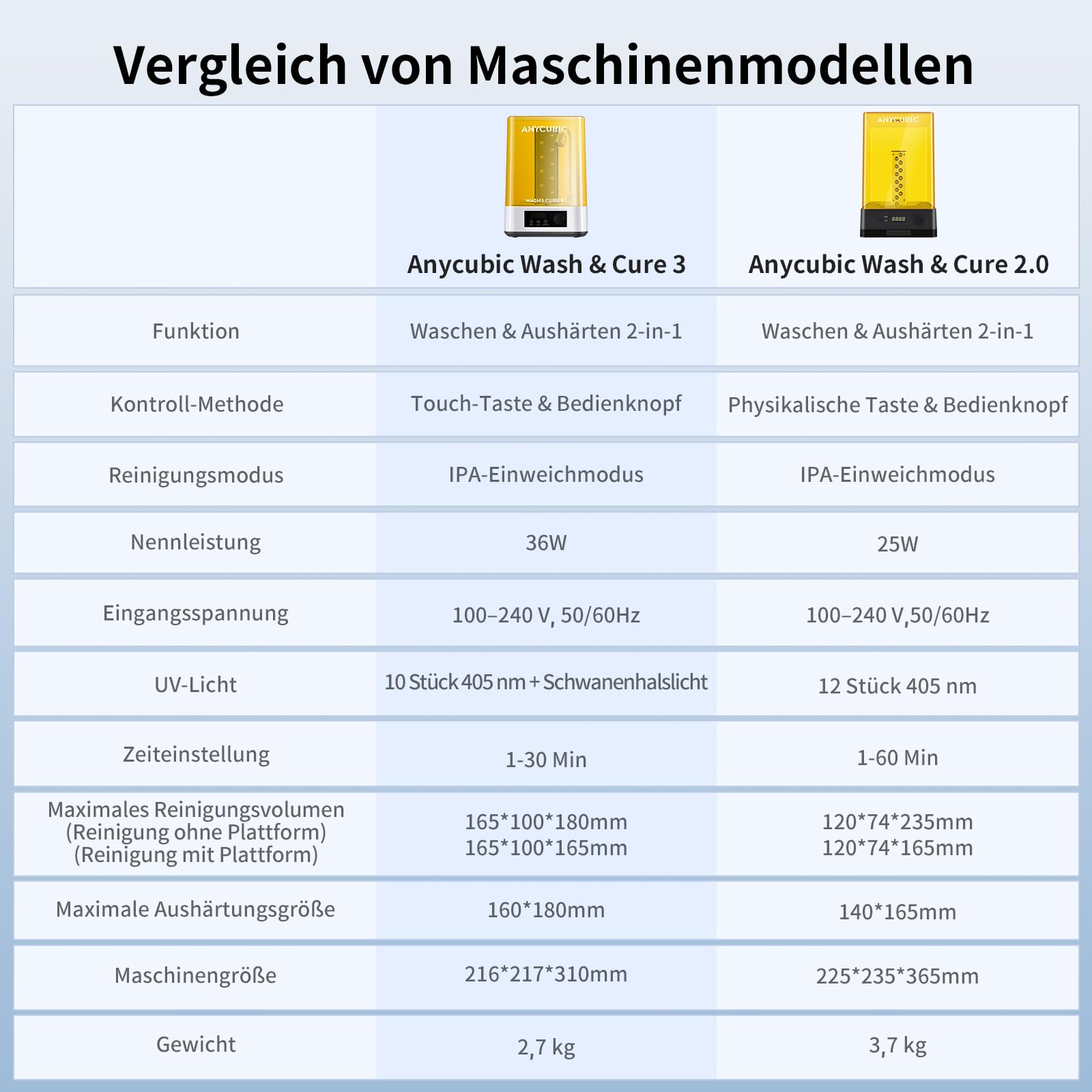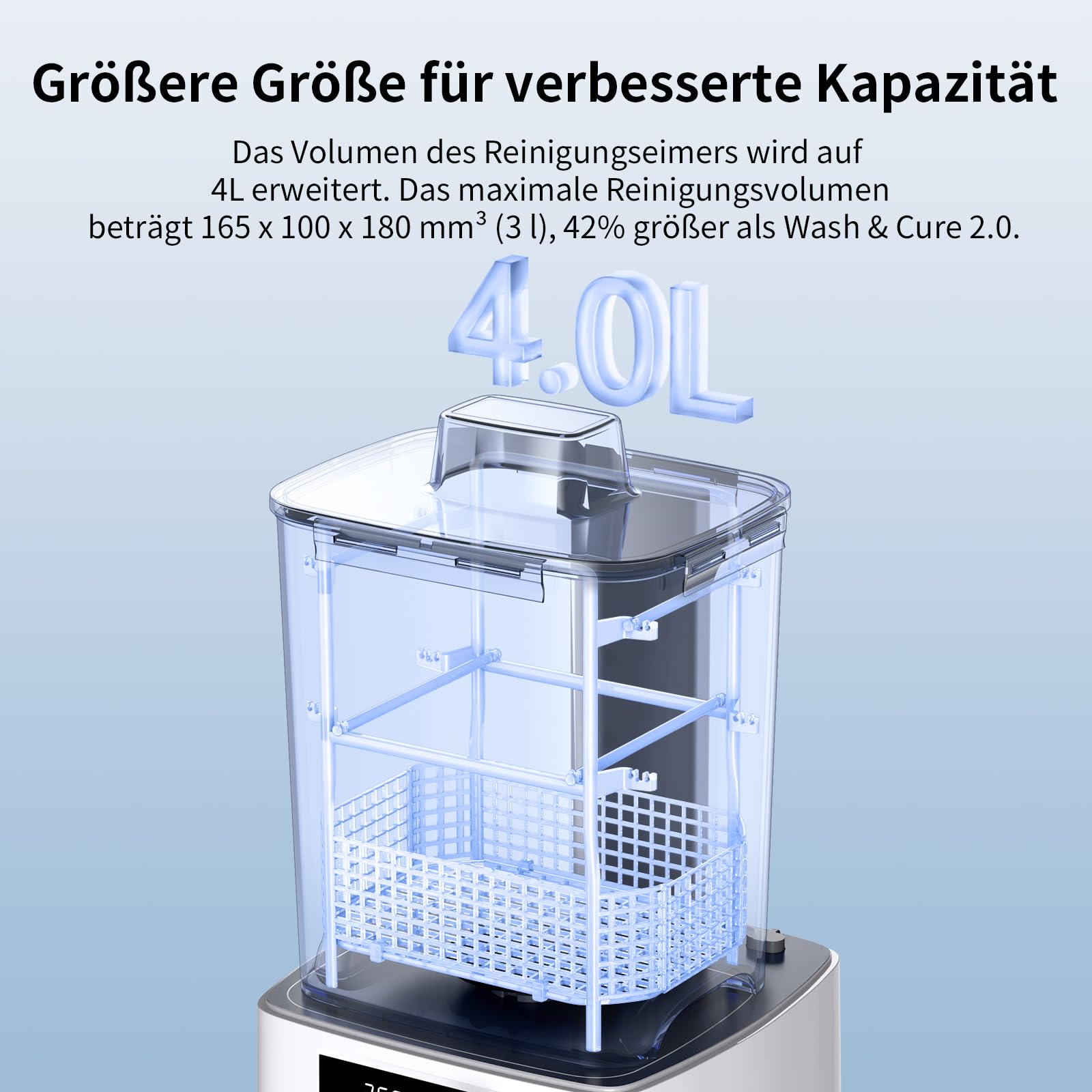- Grosszügiges Volumen: Mit einem um 100 % vergrösserten Waschkorb und einem Fassungsvermögen von 3 Litern bietet das Gerät reichlich Platz für Modelle von LCD-Druckern bis zu 7,3 Zoll.
