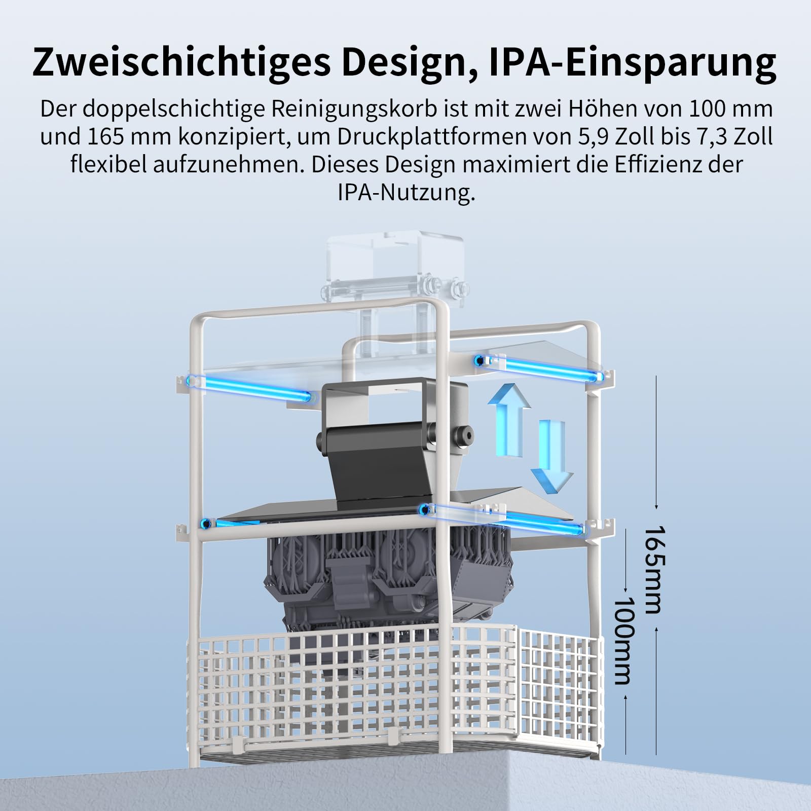 - Effizienter IPA-Verbrauch: Der zweilagige Reinigungskorb aus PP-Material unterstützt das Waschen direkt auf der Bauplattform. Dank zwei einstellbarer Höhen (100 mm und 165 mm) wird der Verbrauch von Isopropylalkohol (IPA) optimiert und Abfall reduziert.