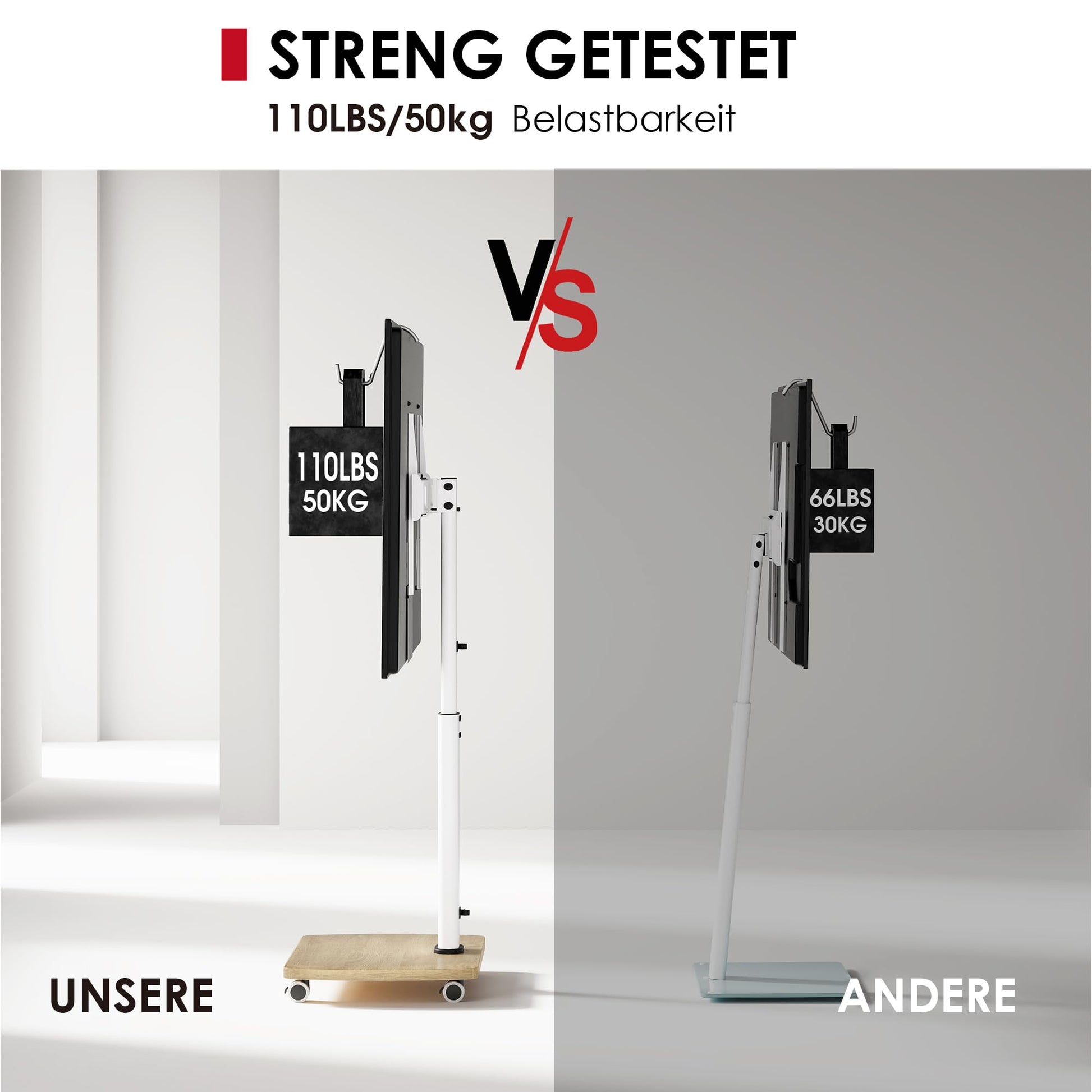 Der robuste Holzsockel sorgt für einen sehr sicheren Stand, selbst bei grossen Fernsehern. Eine zusätzliche Sicherheitssperre fixiert den Fernseher zuverlässig an der Halterung und verhindert ein versehentliches Aushängen.