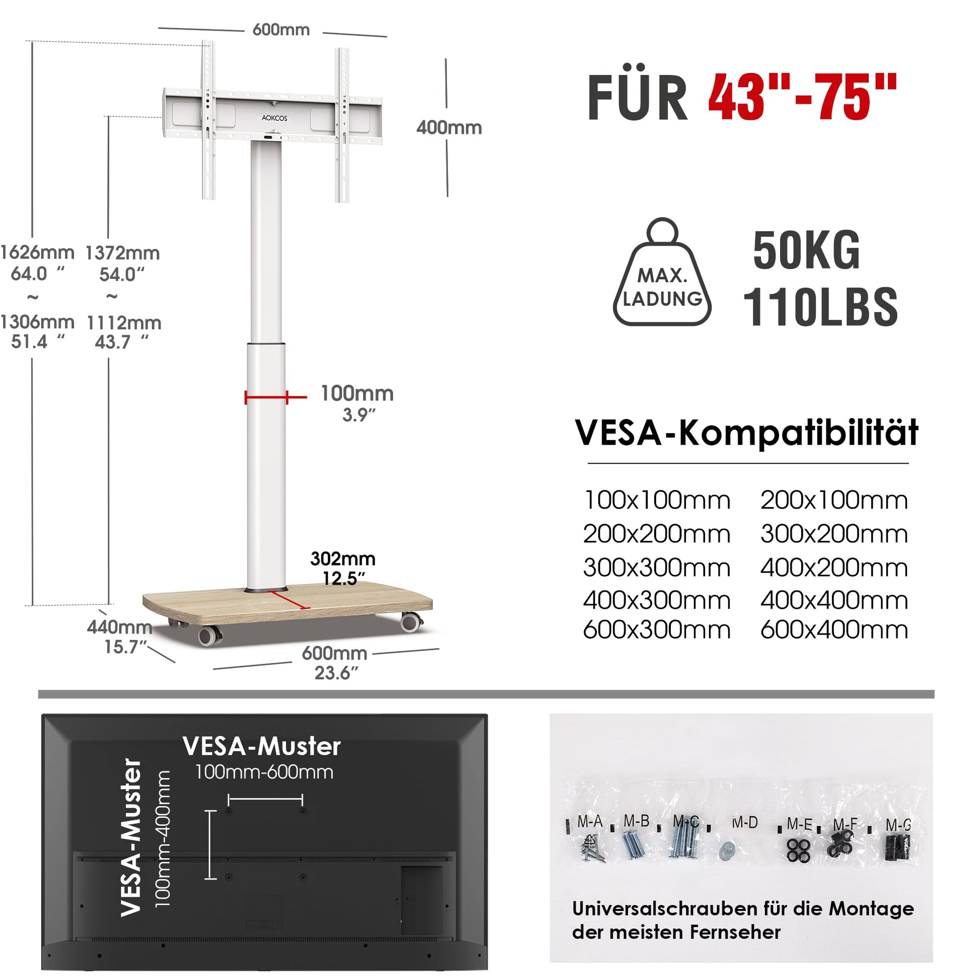 Der Ständer ist universell für die meisten Flach- und Curved-Bildschirme von 43 bis 75 Zoll geeignet. Er trägt ein maximales Gewicht von 50 kg und unterstützt VESA-Montagemuster von 100x100 mm bis 600x400 mm.