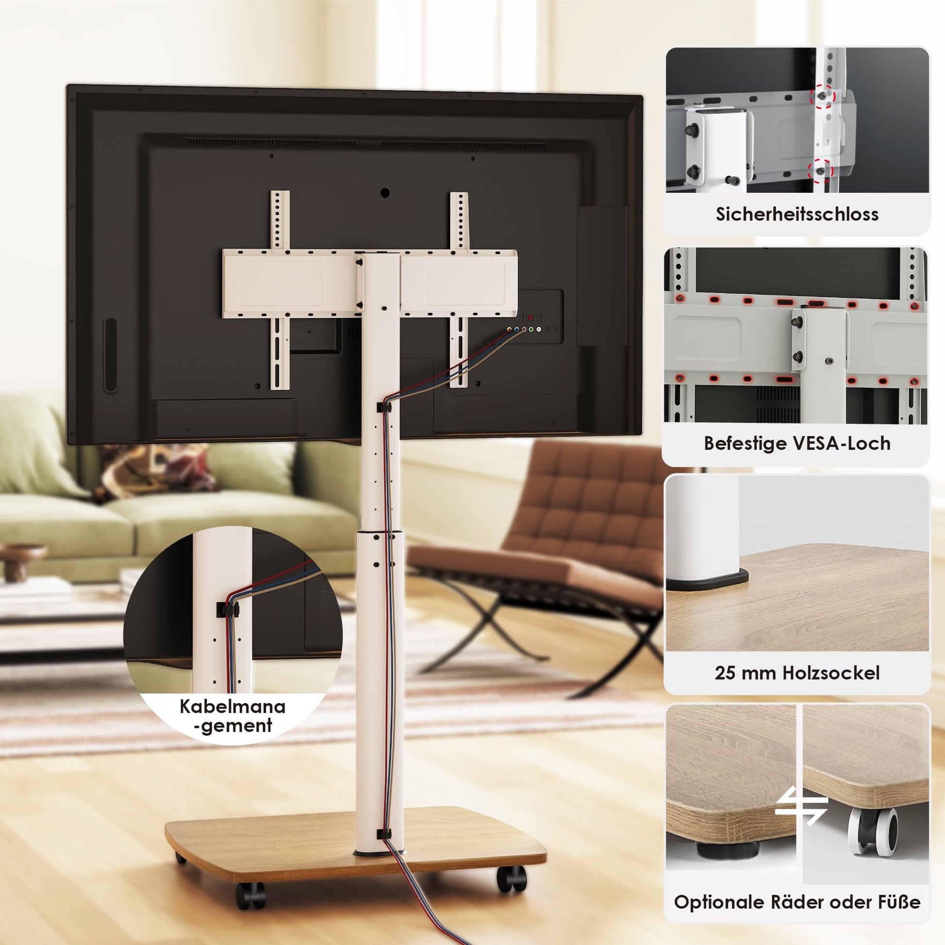 Dieser mobile TV-Bodenständer kombiniert ein elegantes Holzdesign mit maximaler Flexibilität für Ihr Heimkino oder Büro. Er bietet eine stabile und zugleich bewegliche Halterung für grosse Flachbild- und Curved-Bildschirme und fügt sich nahtlos in jedes moderne Wohnambiente ein.