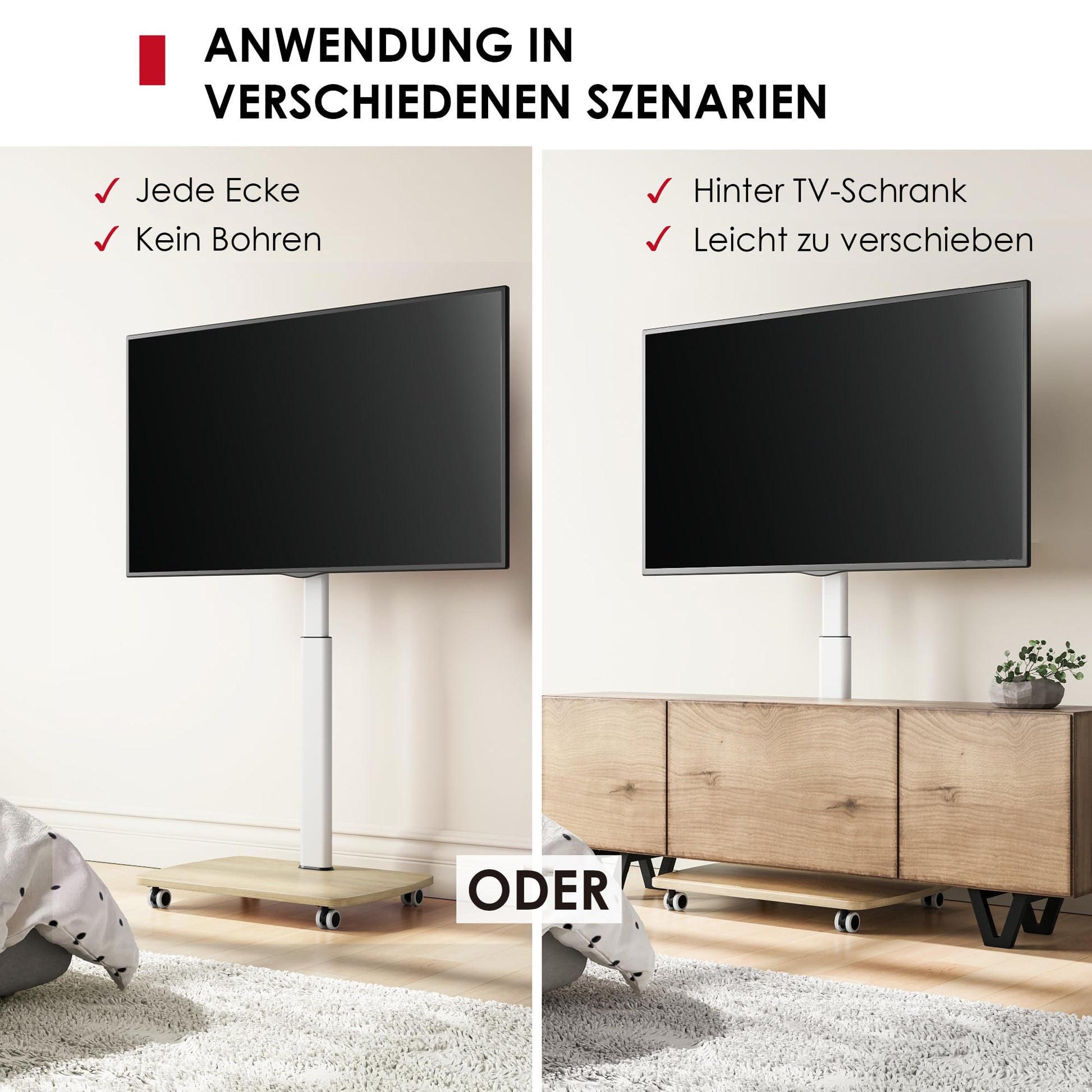 Ja, dank der vier feststellbaren Rollen lässt sich der Fernseher mühelos bewegen und sicher arretieren. Für eine dauerhaft feste Position können die Rollen auch komplett abgenommen werden, was ihn zu einem fixen Bodenständer macht.