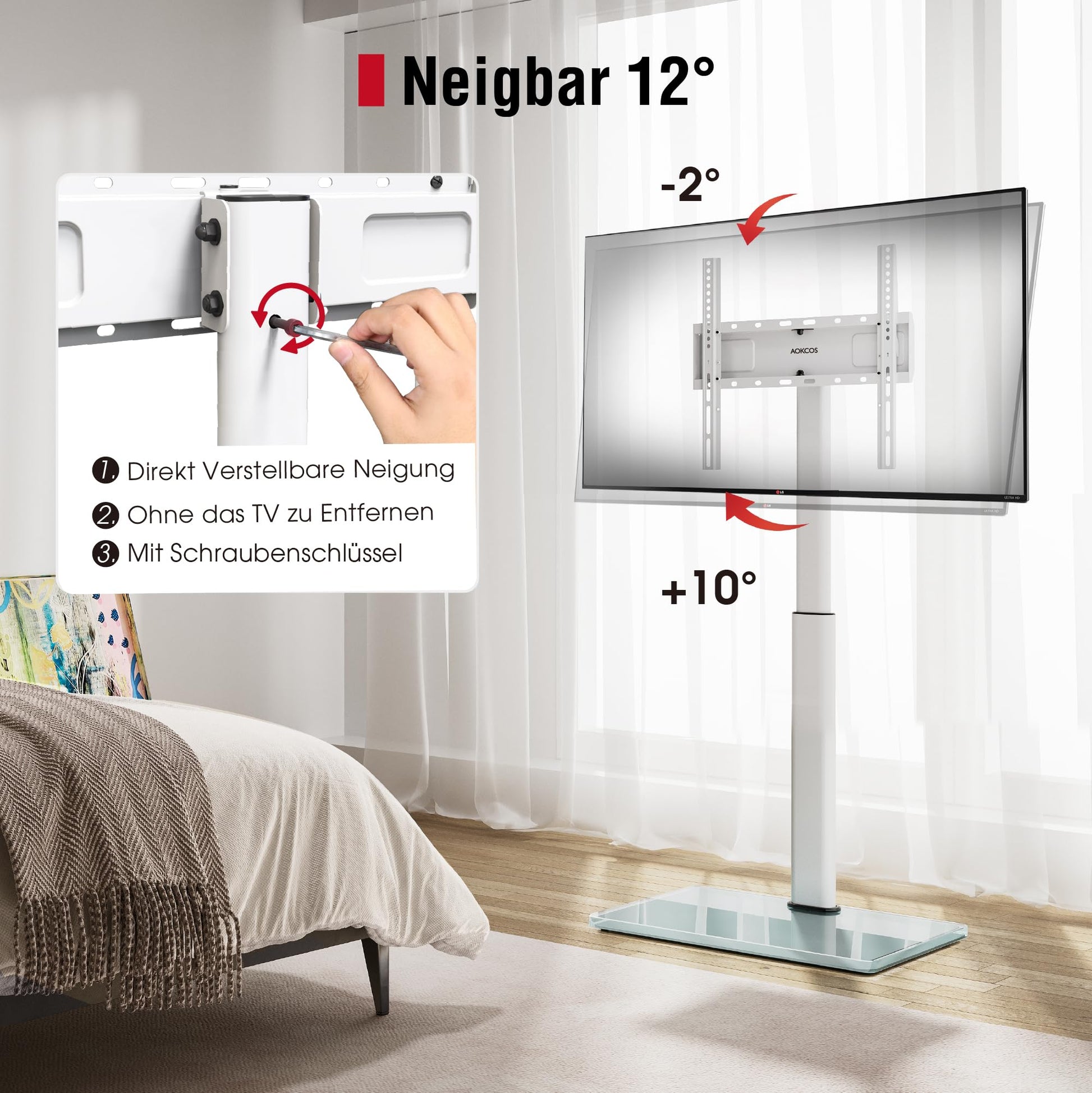 - Werkzeuglose Neigung: Die Neigung des Bildschirms kann um 12 Grad angepasst werden, ohne den Fernseher abzumontieren – einfach die Schrauben mit dem mitgelieferten Werkzeug justieren.