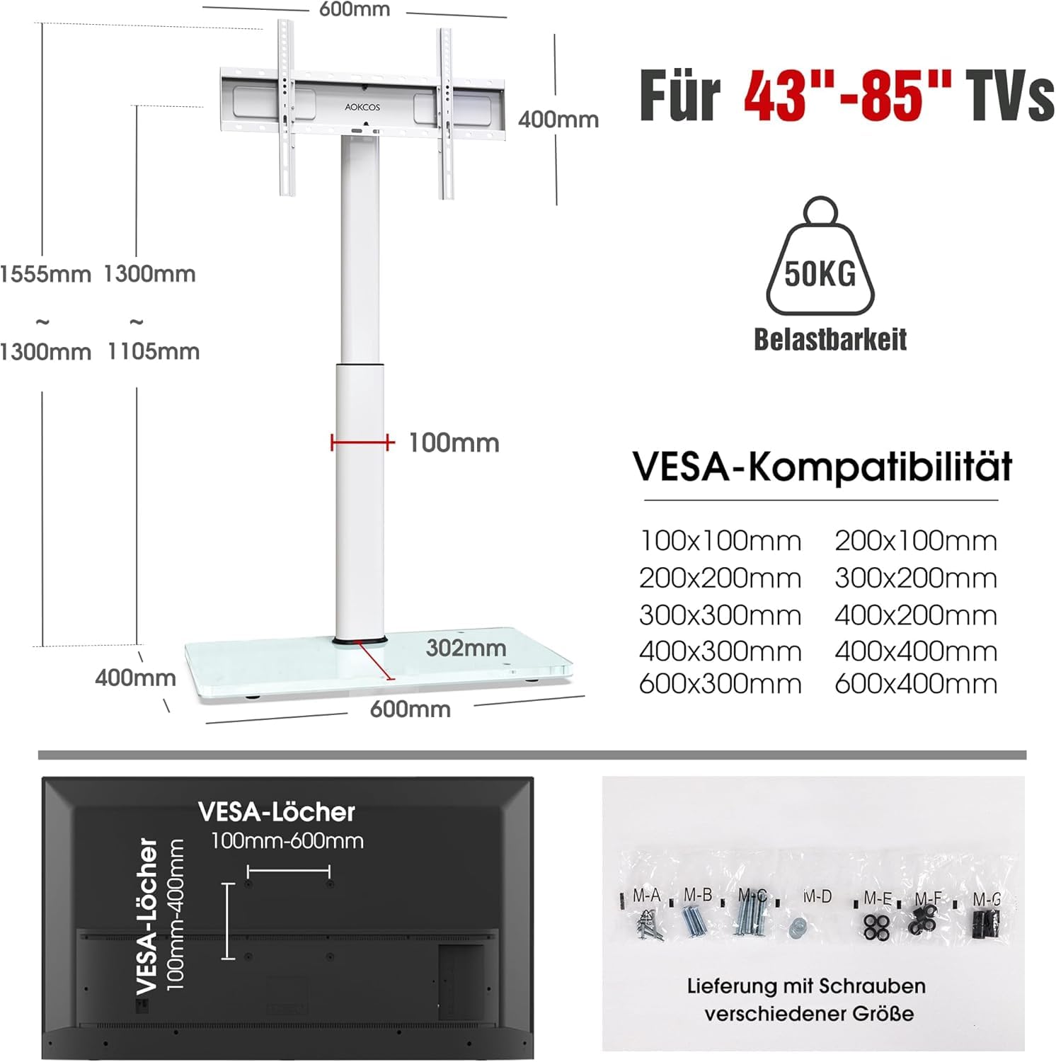 AOKCOS Universal TV Bodenständer 1.6m 43-85 Zoll – Weiss