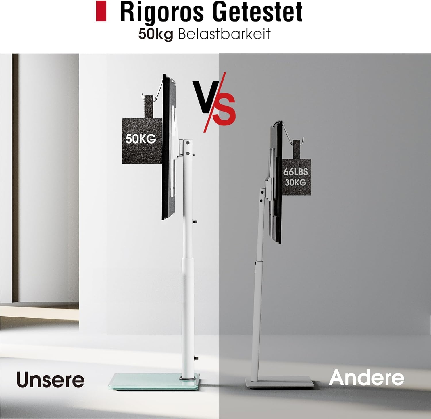 - Robuste Konstruktion: Ein massives 10-cm-Standrohr und ein breiter 600-mm-Sockel gewährleisten maximale Stabilität und einen sicheren Halt, selbst für die grössten und schwersten Fernsehgeräte.
