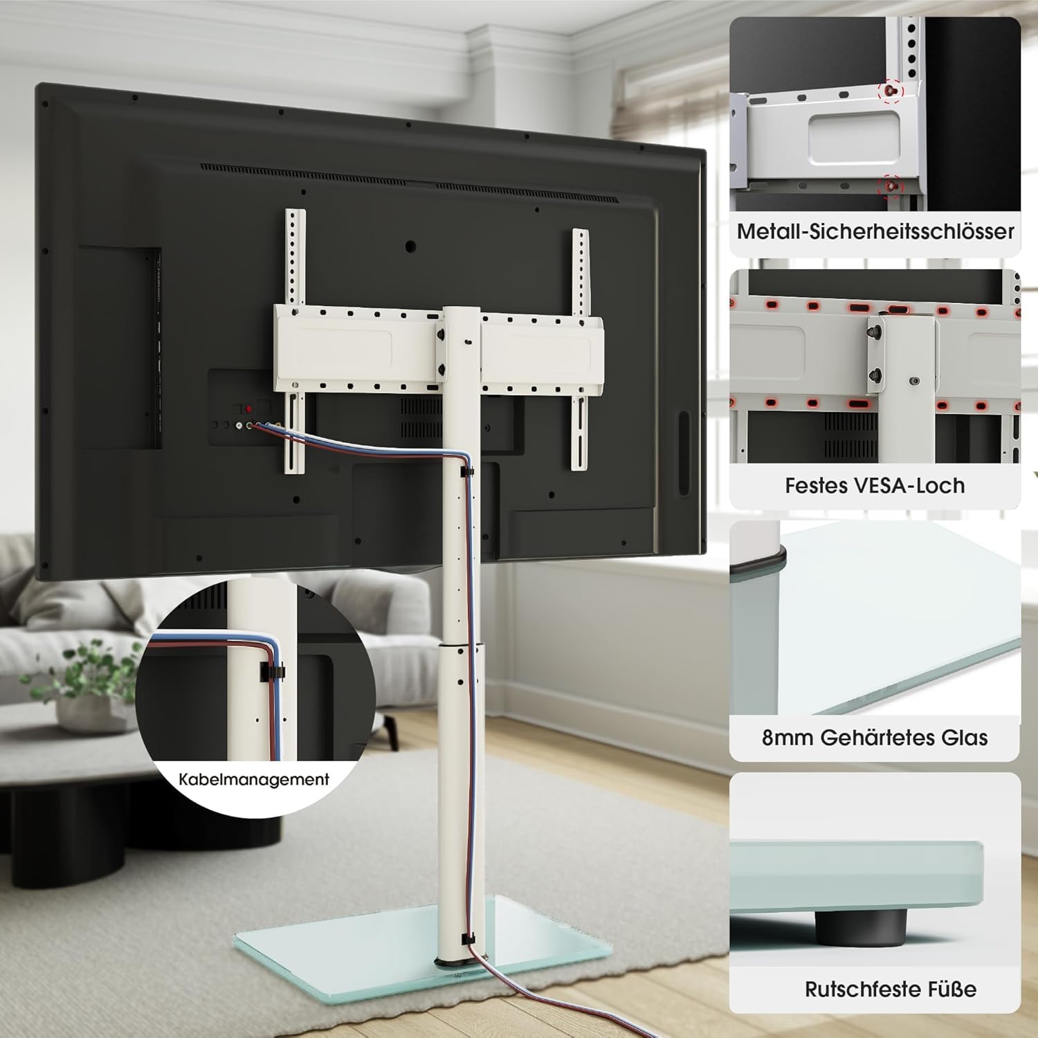 Dieser elegante TV-Bodenständer in Weiss ist die ideale Lösung, um Ihren Fernseher flexibel und sicher im Raum zu positionieren. Er kombiniert ein stilvolles, modernes Design mit hoher Funktionalität und Stabilität, um Ihnen ein erstklassiges Seherlebnis zu ermöglichen.