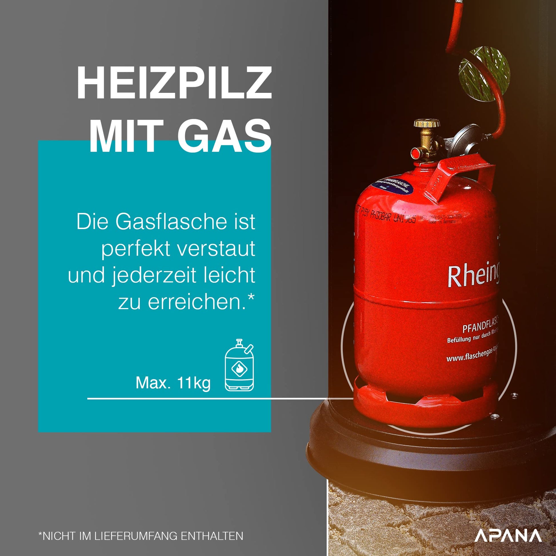 Sie können handelsübliche 5 kg oder 11 kg Propan-Gasflaschen verwenden, die im robusten Gehäuse Platz finden. Eine 11-kg-Flasche ermöglicht eine ungefähre Heizdauer von 11 bis 14 Stunden, abhängig von der gewählten Heizstufe.