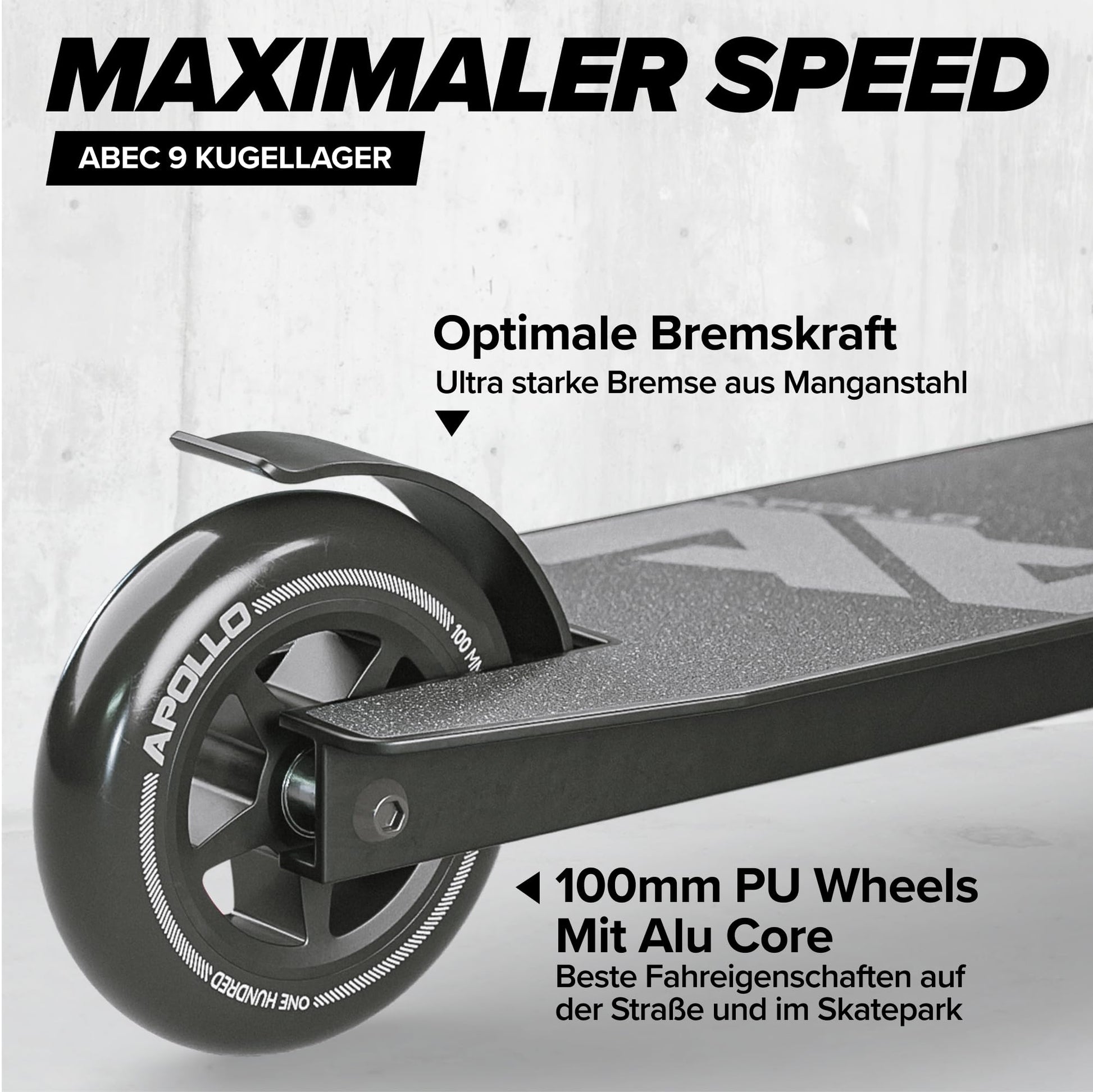 Für eine erstklassige Performance sorgen die 100 mm PU-Rollen mit solidem Aluminiumkern und die hochwertigen ABEC 9 High-Speed-Kugellager, die eine besonders schnelle und geschmeidige Fahrt garantieren.