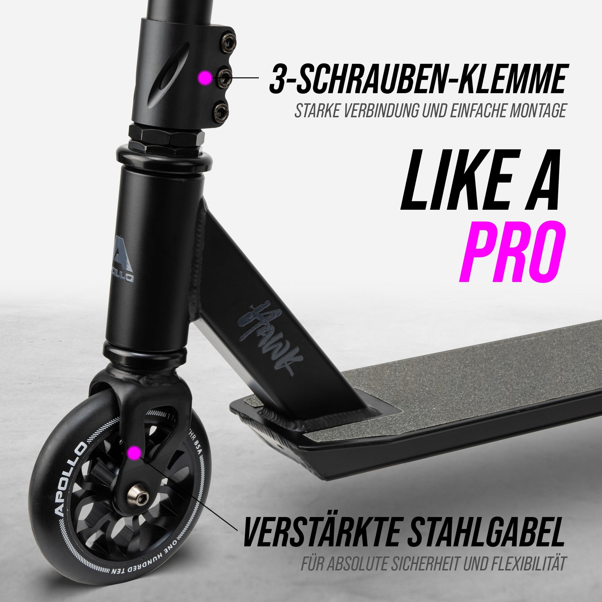 Der Apollo Hawk Stuntscooter wird vormontiert geliefert. Sie müssen lediglich den Lenker auf die Gabel stecken und die Klemme mit dem mitgelieferten Werkzeug festziehen. Das dauert nur wenige Minuten und schon ist der Scooter einsatzbereit.