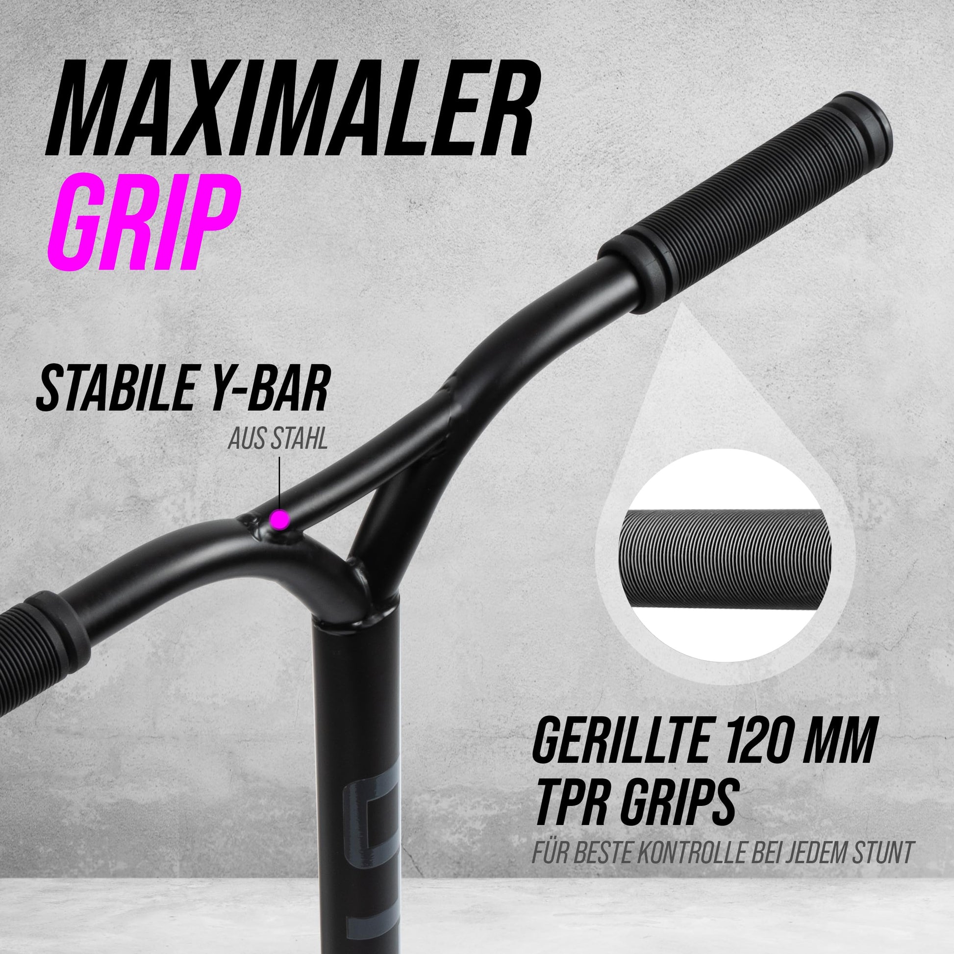 - Um 360° drehbarer Y-Lenker für volle Trick-Kontrolle