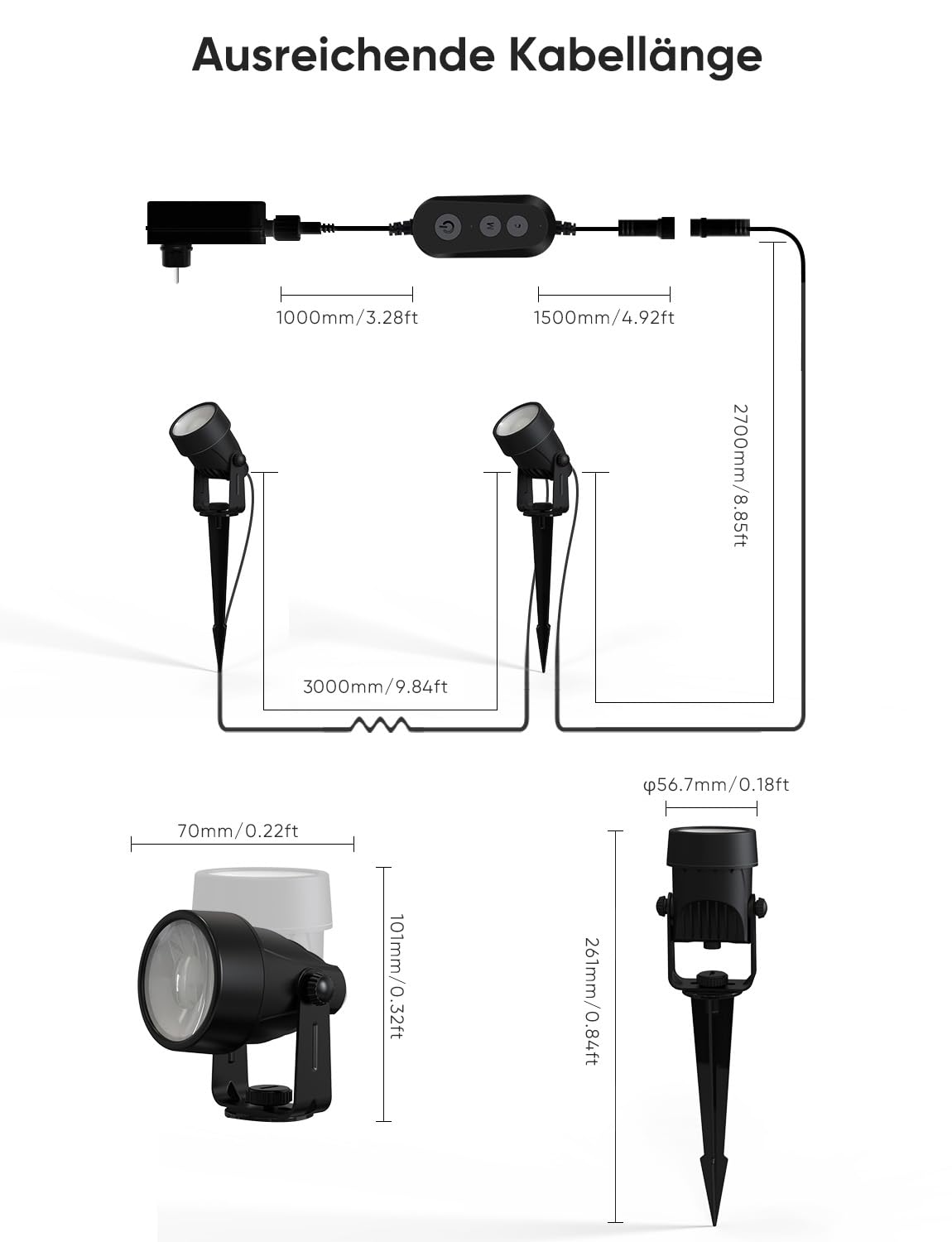Kabellängen: Das Kabel vom Netzteil zum ersten Strahler misst 5,2 Meter. Der Abstand zwischen den einzelnen Strahlern beträgt jeweils 3,0 Meter.