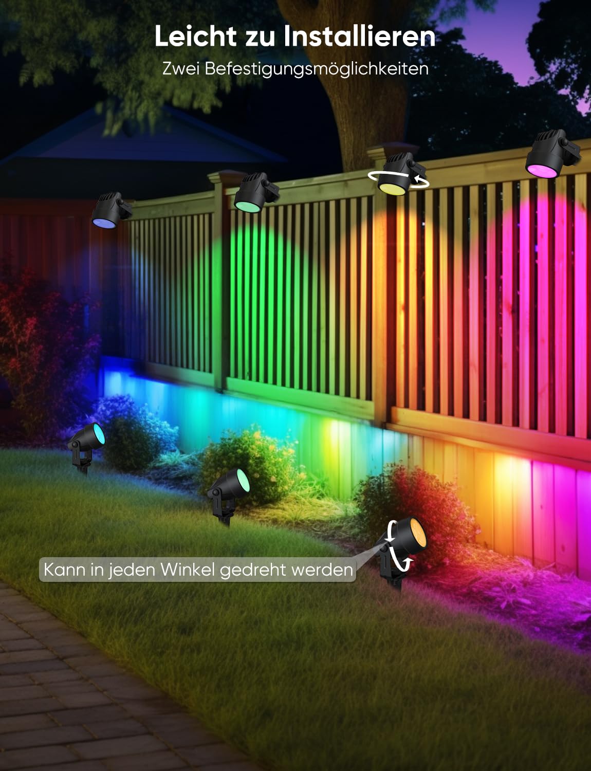 - Individuelle Farbgestaltung: Dank fortschrittlicher RGBW-Technologie lässt sich die Farbe jedes Strahlers einzeln steuern. Wählen Sie aus 16 Millionen Farben und erwecken Sie Ihren Garten mit einzigartigen Lichteffekten zum Leben. (Hinweis: Mehrere Sets können nicht direkt miteinander verbunden werden.)
